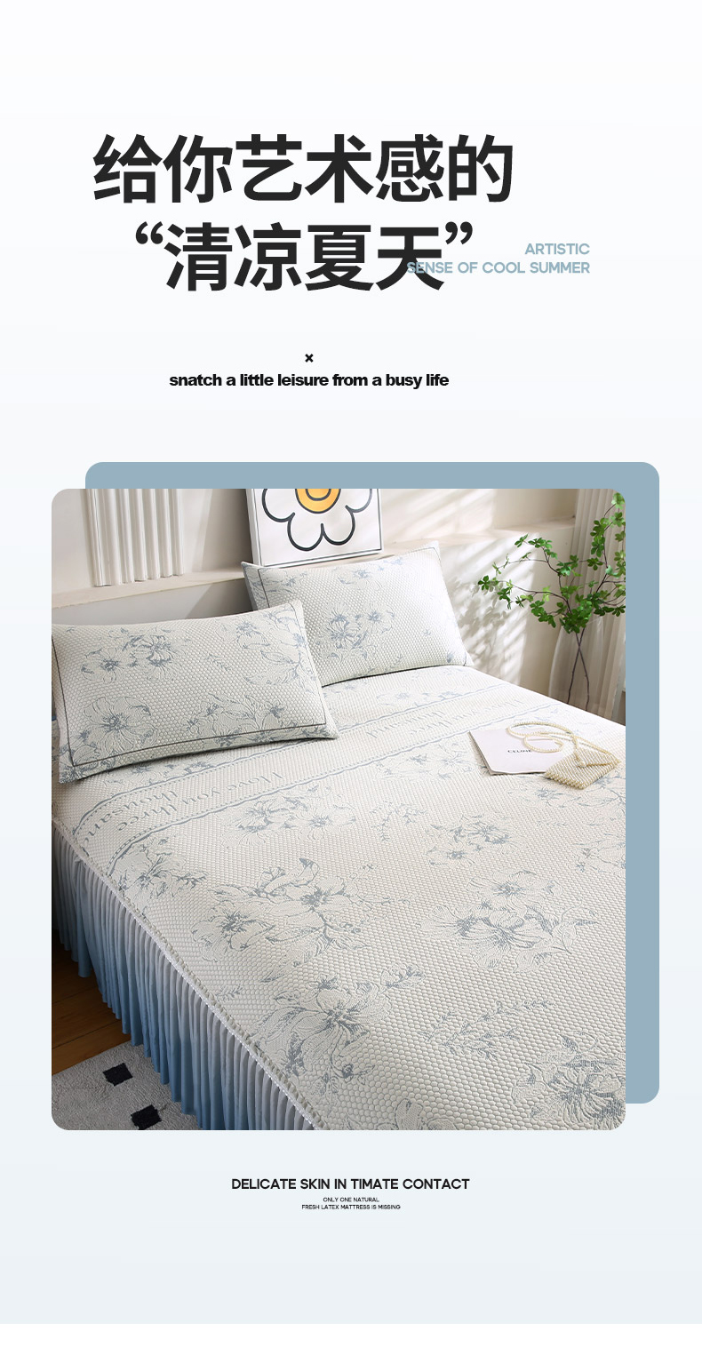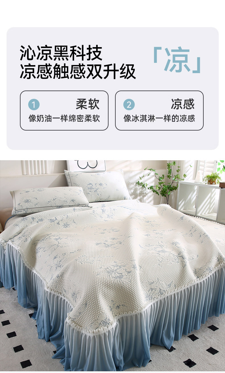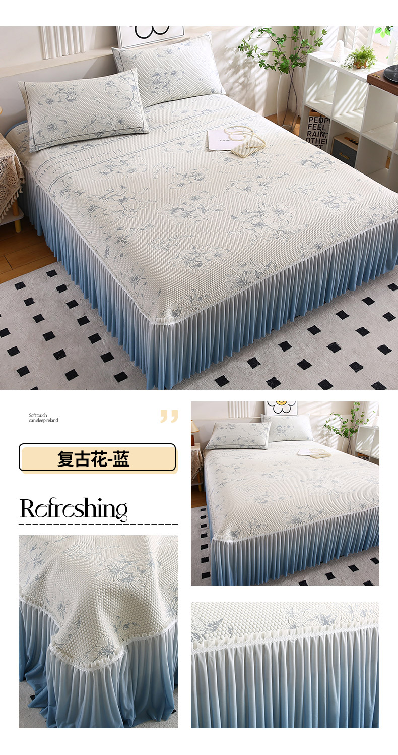 商品名称:法莱妮2025夏季新款A类真凉感丝提花三明治冰豆豆凉席床裙三件套 复古花-蓝