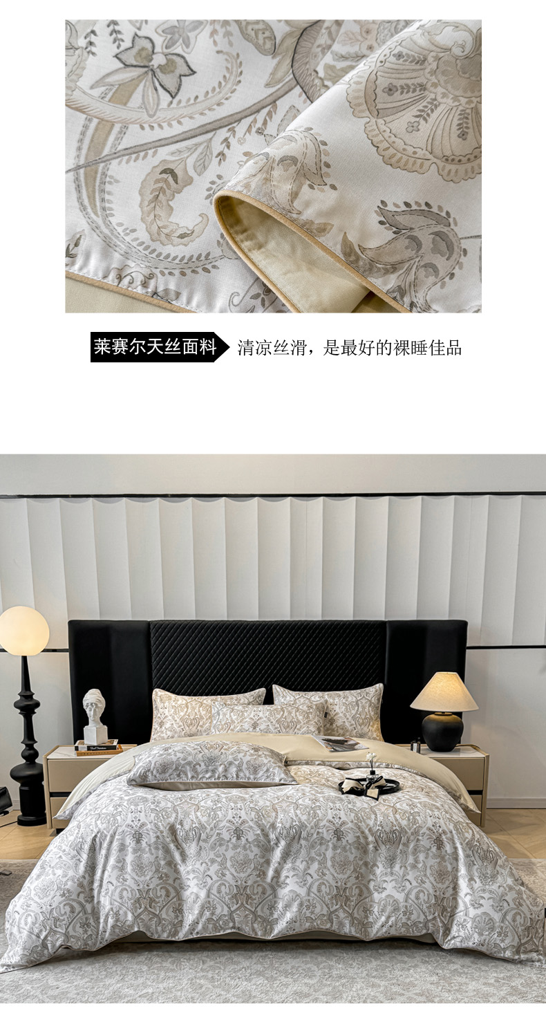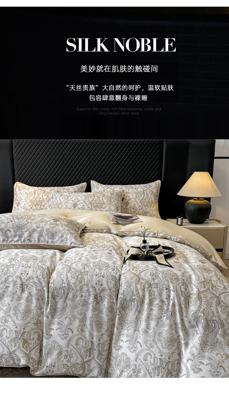 商品名称:芊寻家居 2025春夏新款50支莱赛尔天丝贡缎数码印花麻绳款四件套高端礼盒 伯爵咖