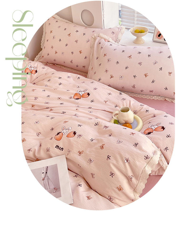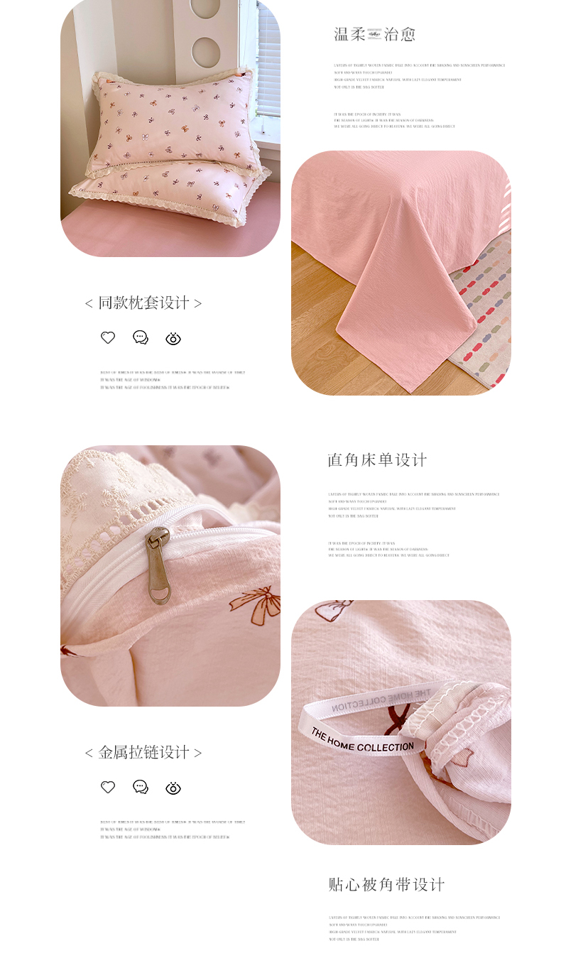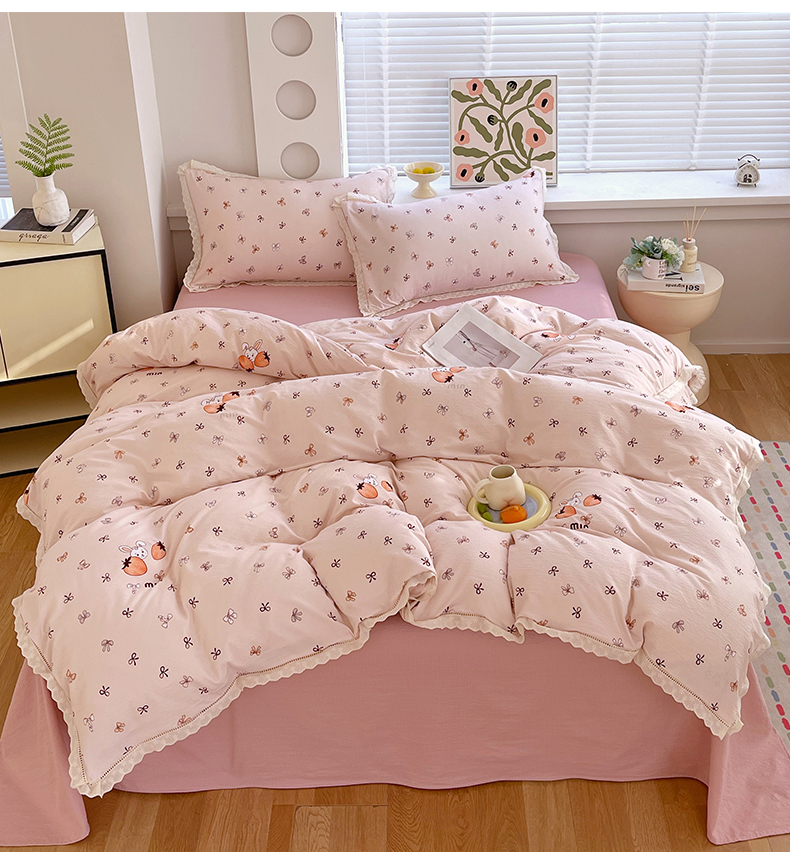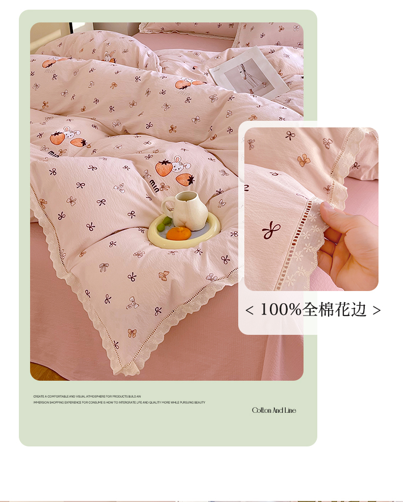 商品名称:雨彤家纺 2025新款A类高克重云感皱皱双层纱全棉镂空花边款法式四件套-床拍图 春花-粉