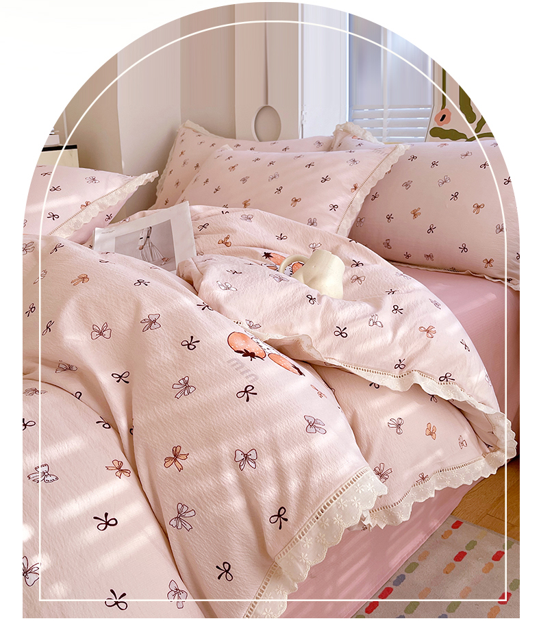 雨彤家纺 2025新款A类高克重云感皱皱双层纱全棉镂空花边款法式四件套-床拍图 春花-粉