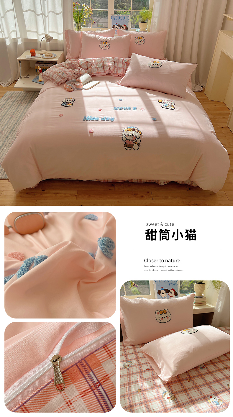当前位置: 91家纺网 > 商品网购 > 床品套件 > 四件套 > 水洗棉四件套 > 韩都家居 2025新款卡通软萌水洗棉毛巾绣四件套 甜筒小猫