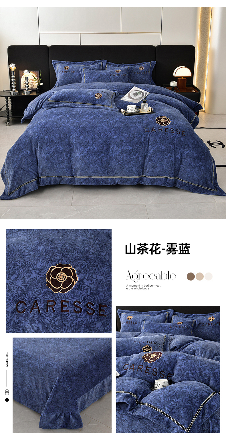 商品名称:妮恒美家纺 2025新款高克重牛奶绒刺绣四件套-山茶花-雾蓝