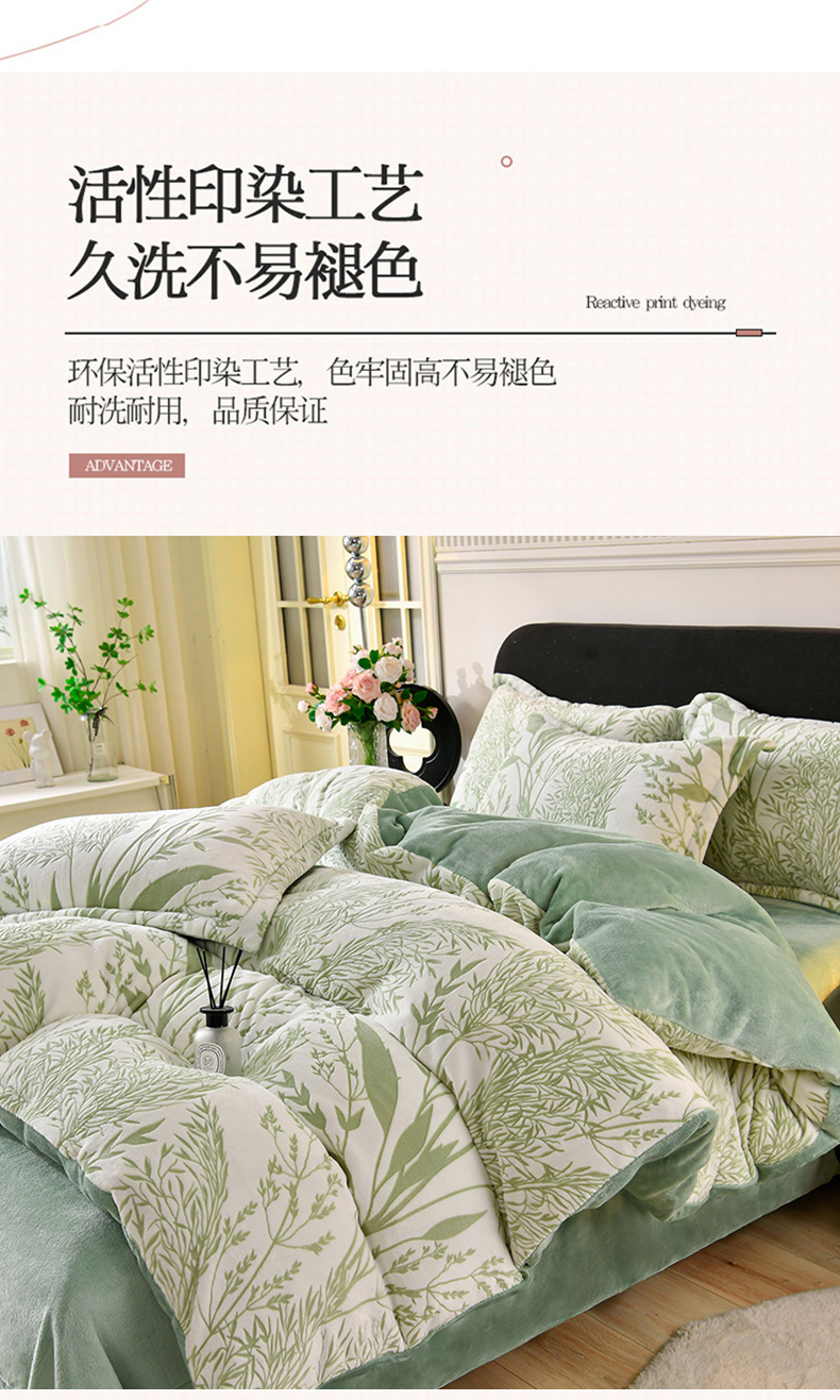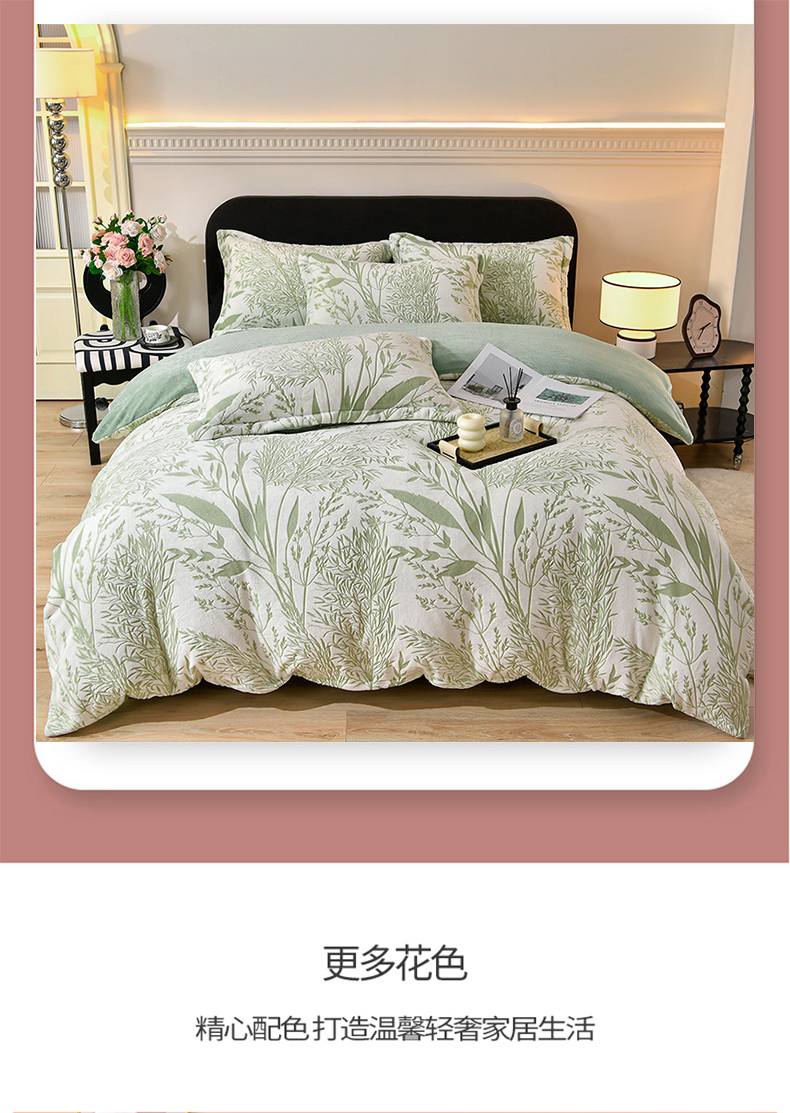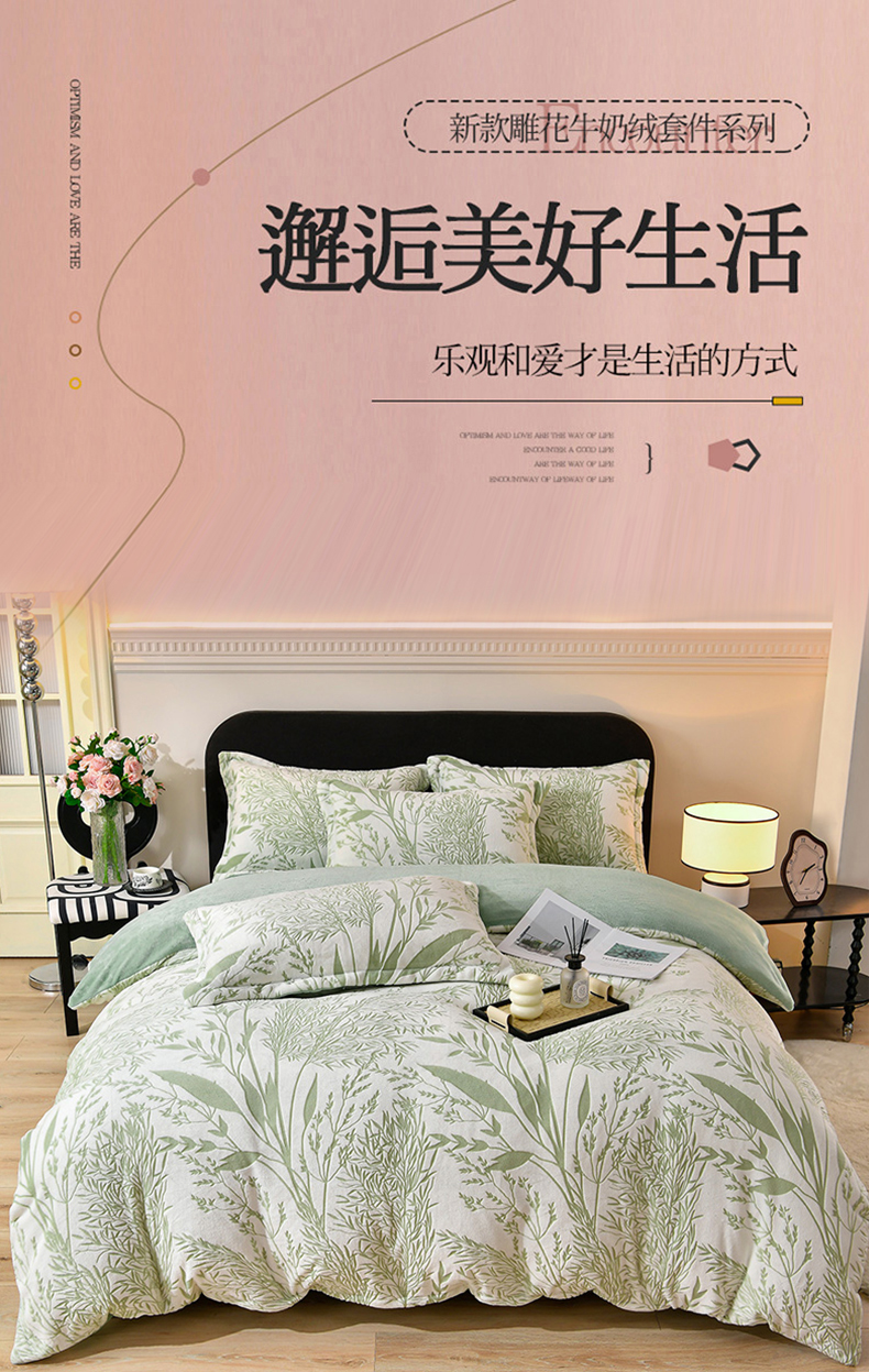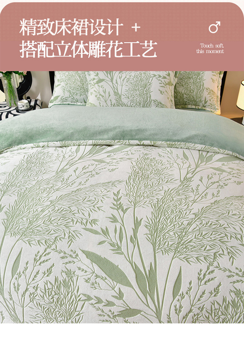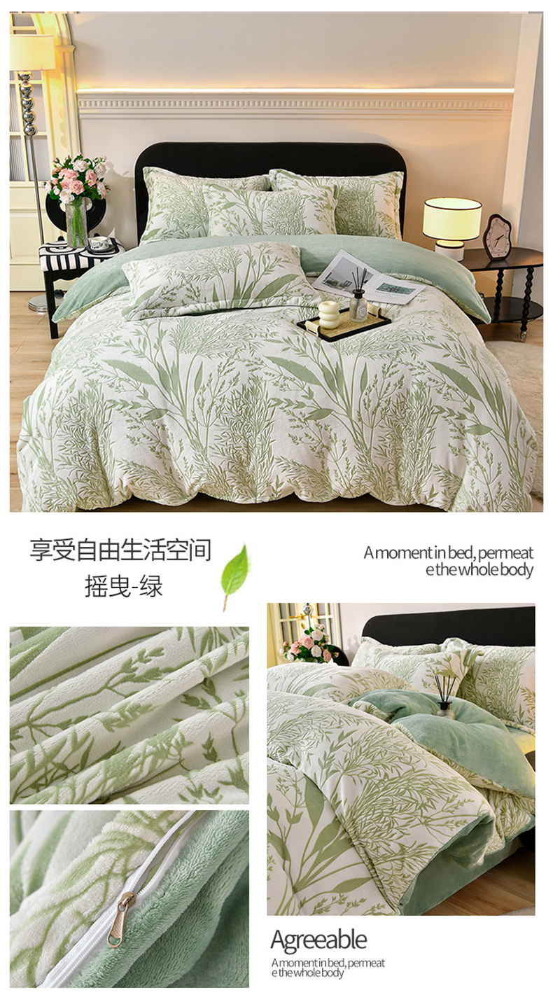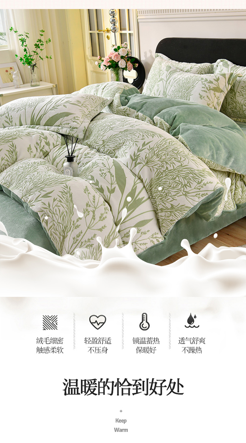 商品名称:梦之星 2025新款8斤重牛奶绒6D雕花绒四件套法莱水晶金貂 摇曳-绿