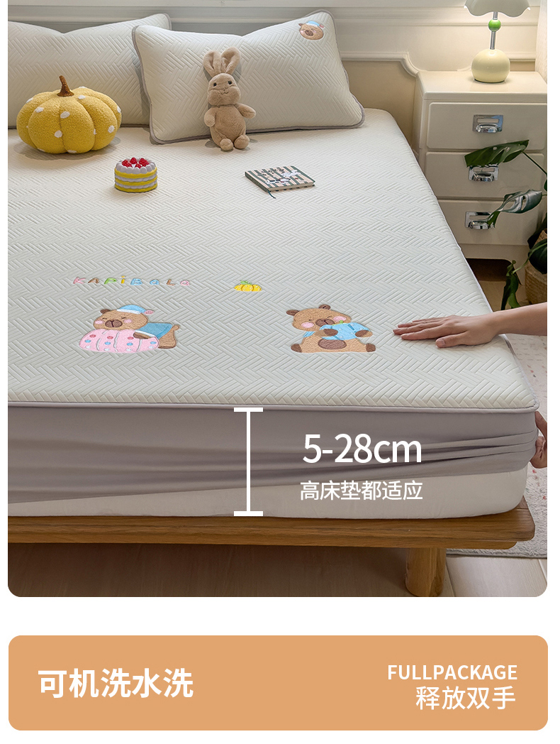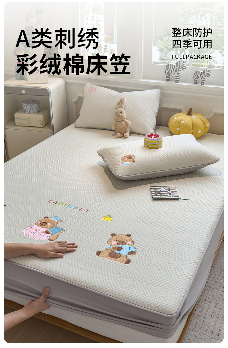莱家富 2025新款A类三联刺绣毛巾绣夹棉床笠三件套单床笠 微笑小猫-樱花粉