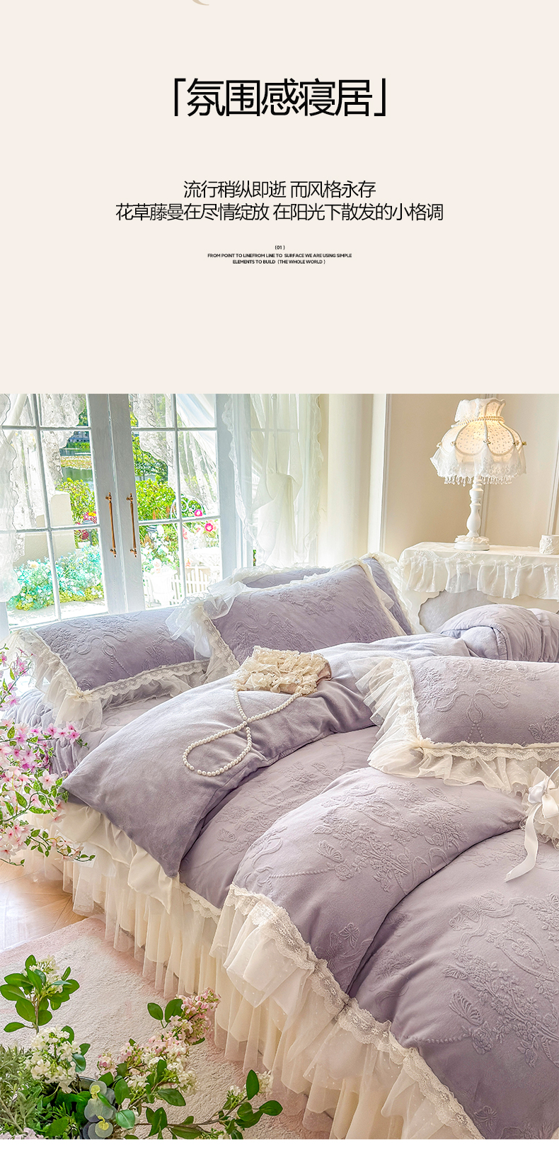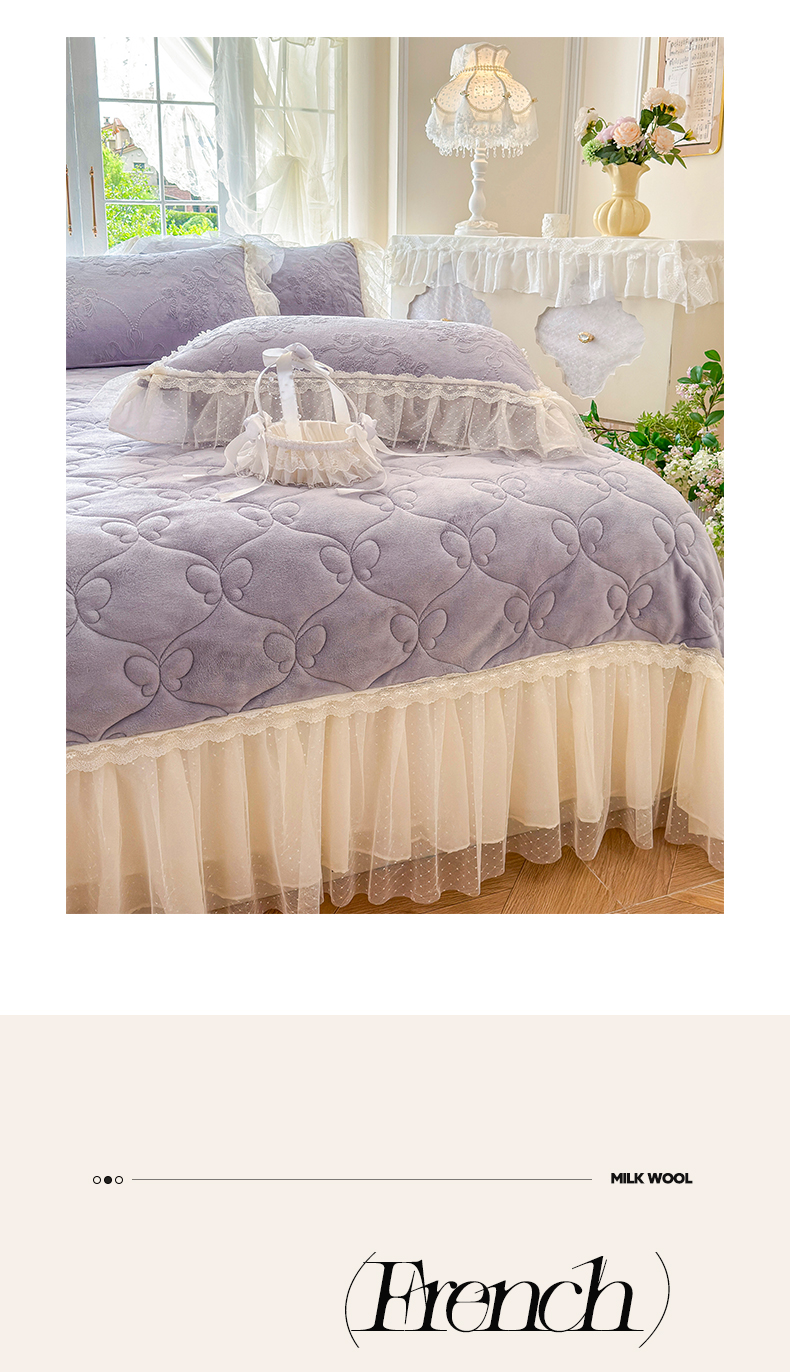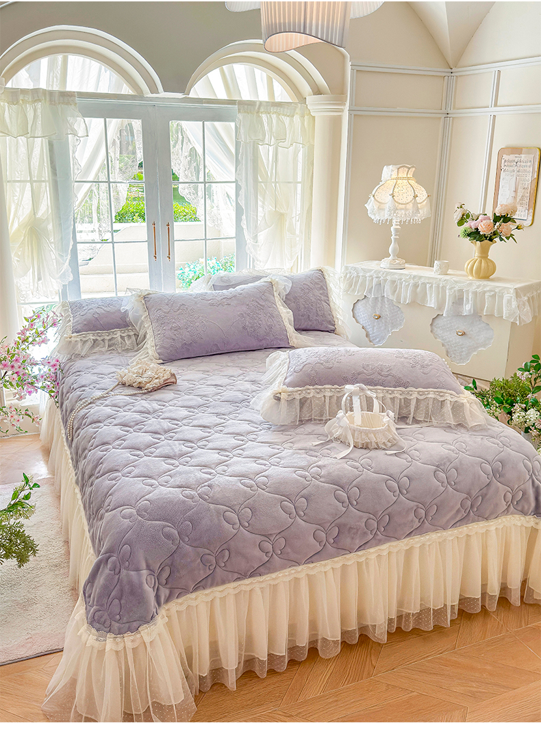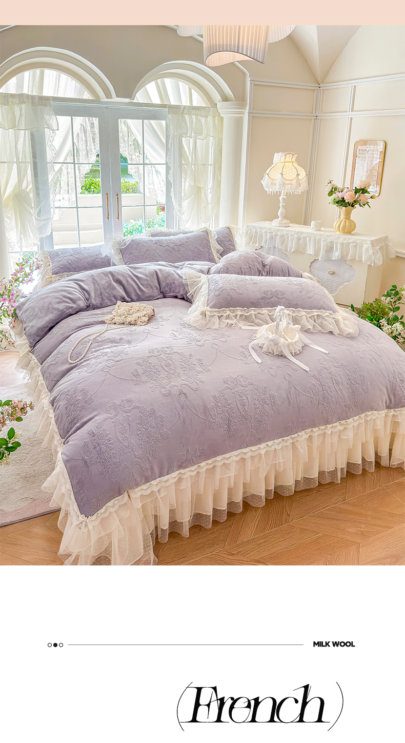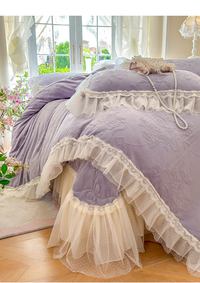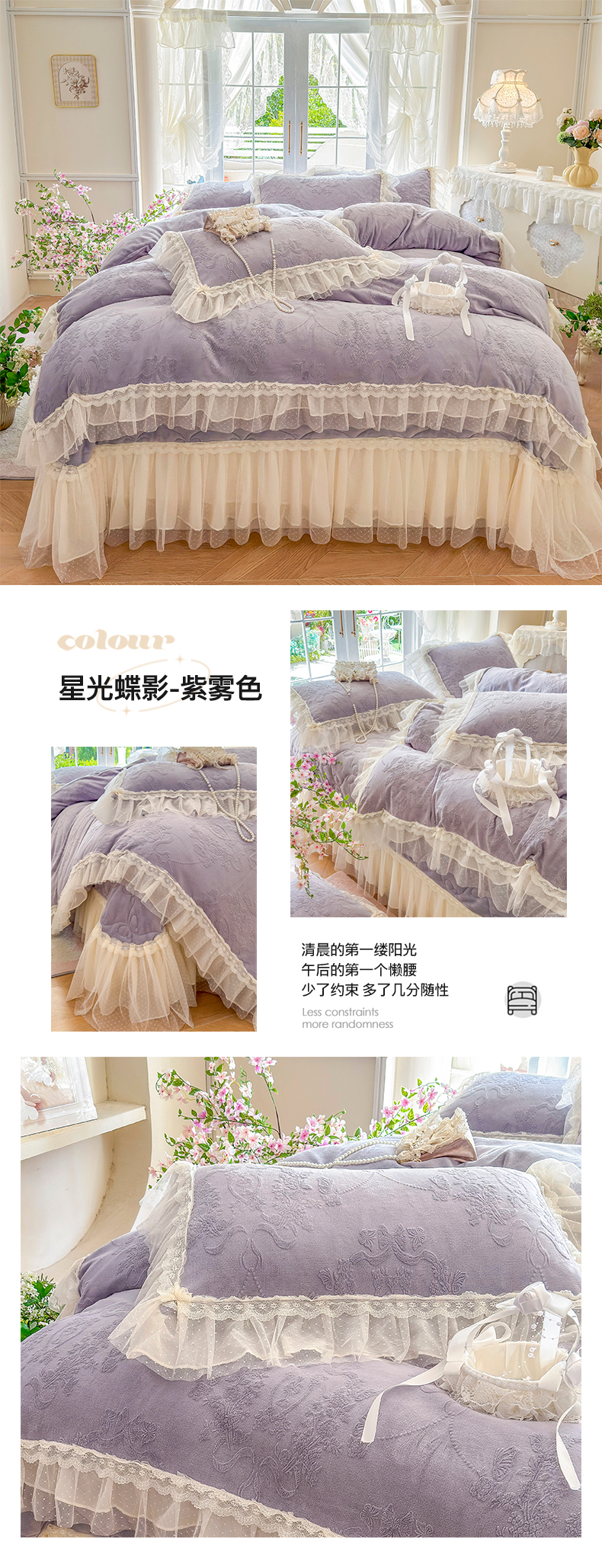 商品名称:虹星家纺 2025新款法式雕花牛奶绒花边床盖四件套-星光碟影 星光蝶影-紫雾色