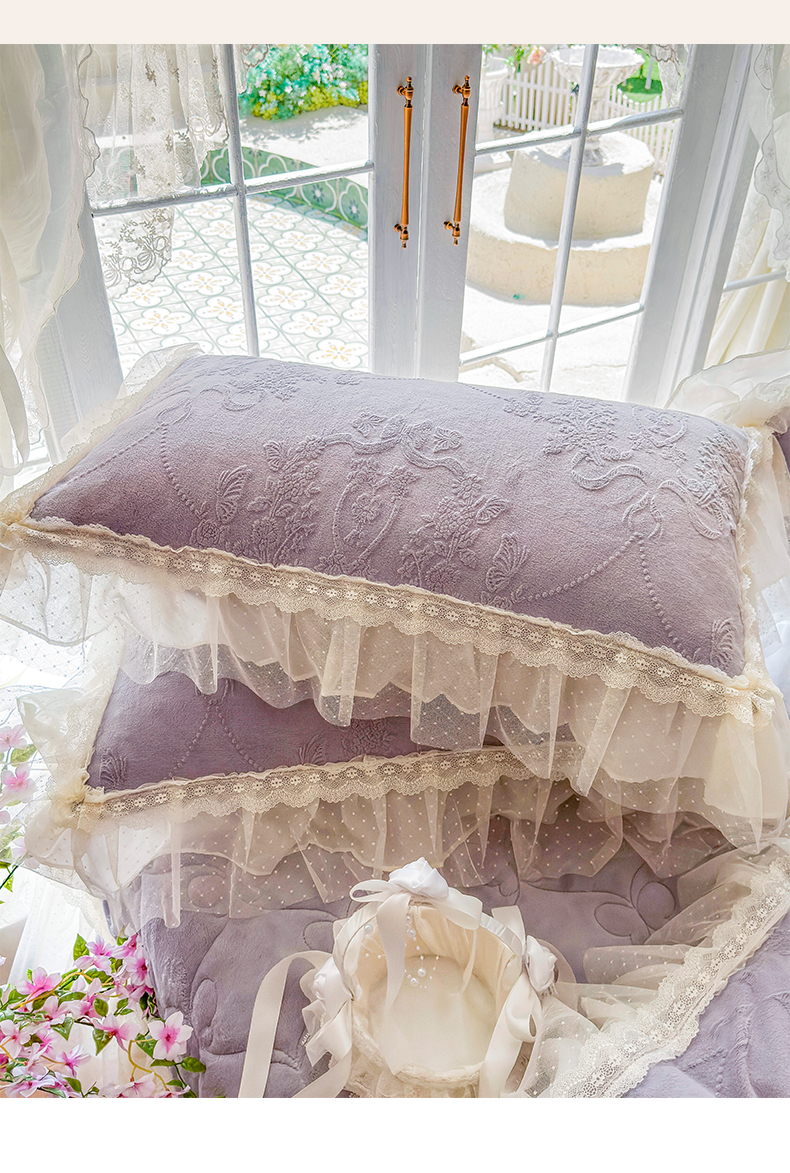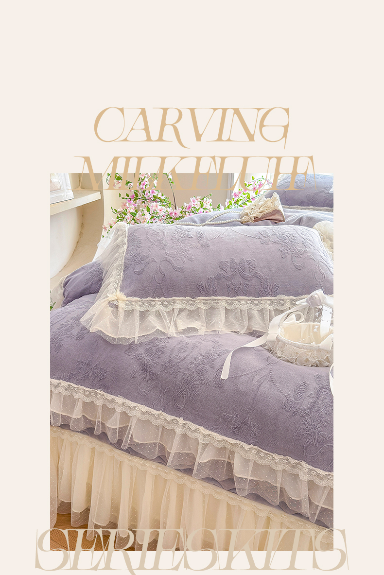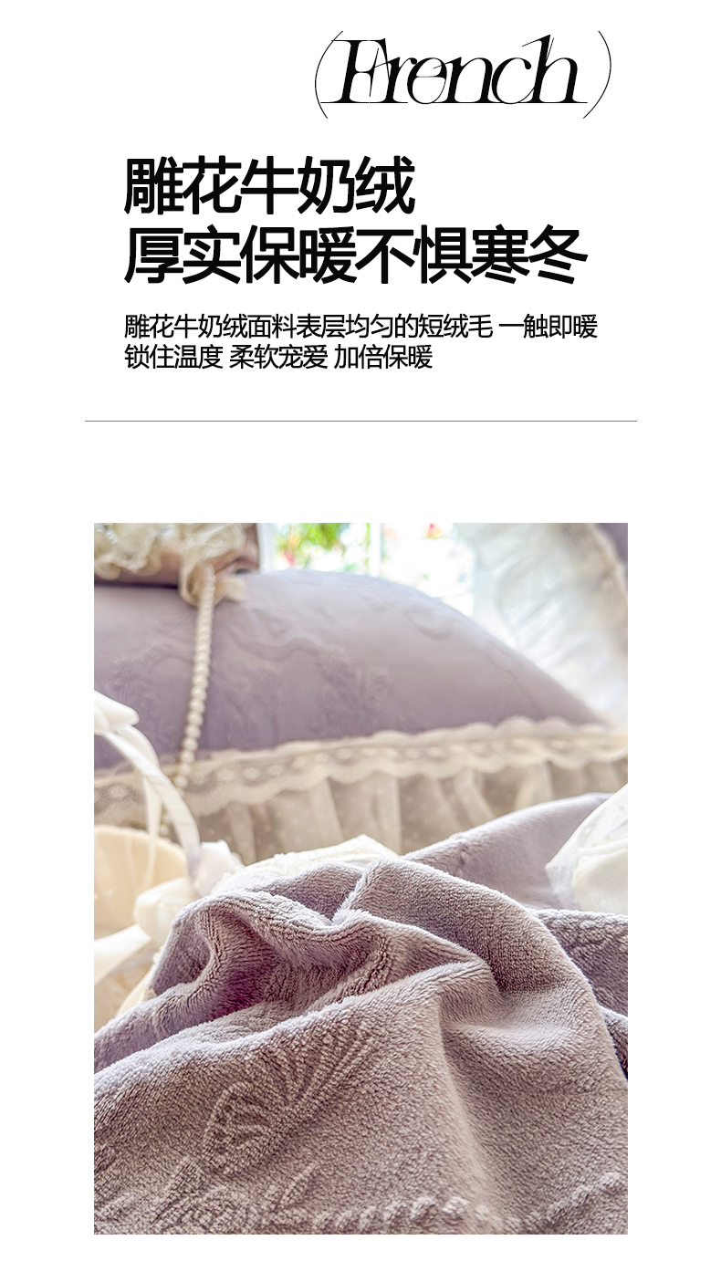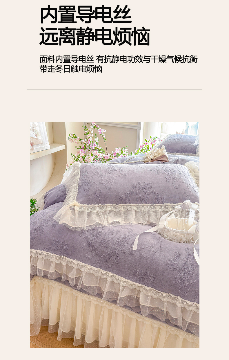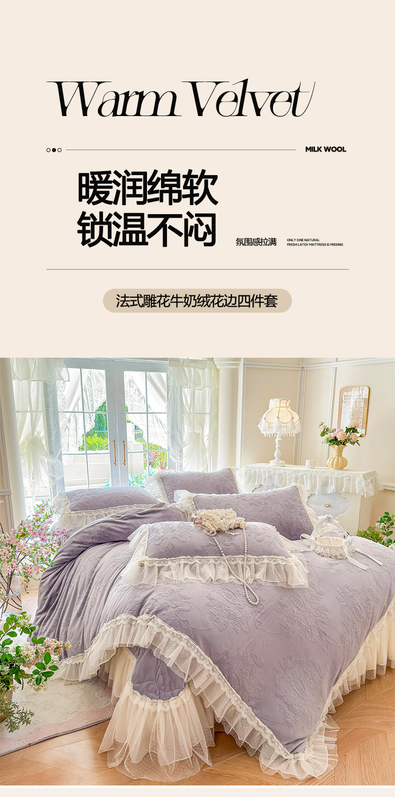 商品名称:虹星家纺 2025新款法式雕花牛奶绒花边床盖四件套-星光碟影 星光蝶影-紫雾色