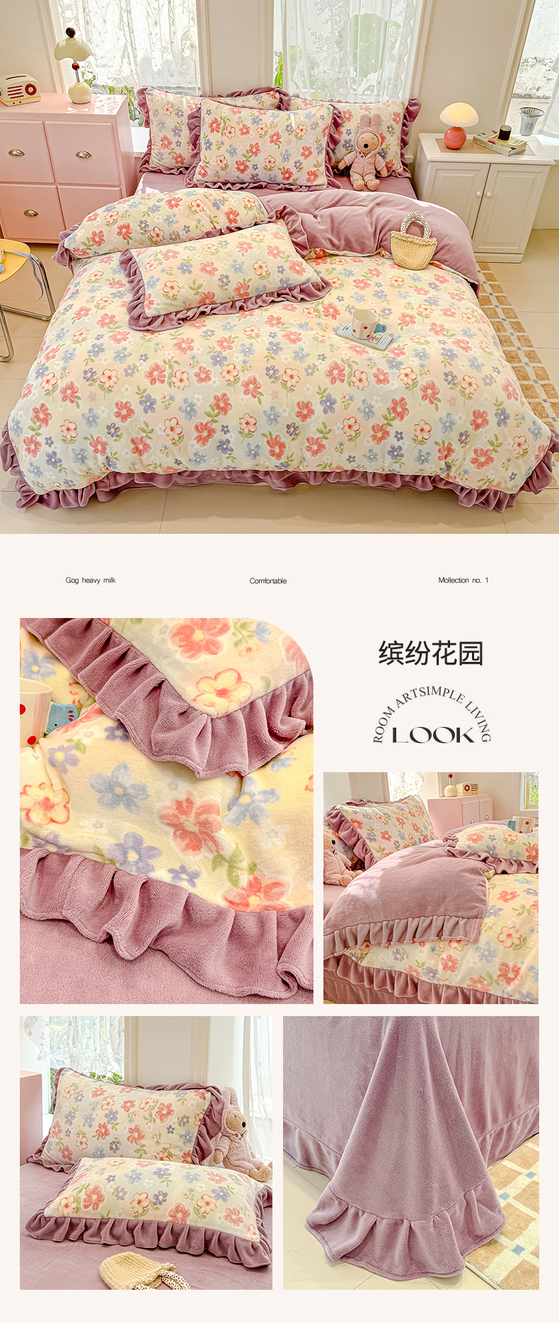 商品名称:归属 2025新款韩版花边牛奶绒四件套 暖蝶玫瑰
