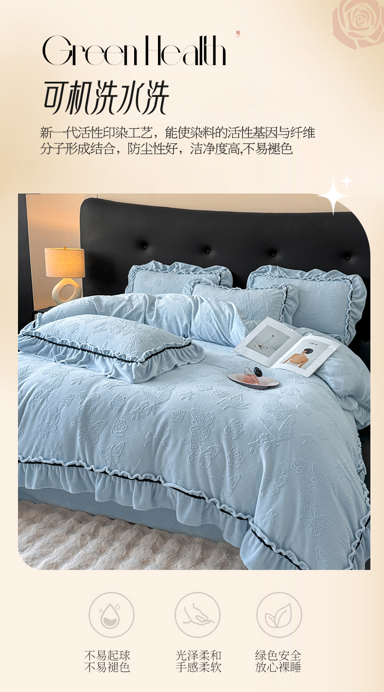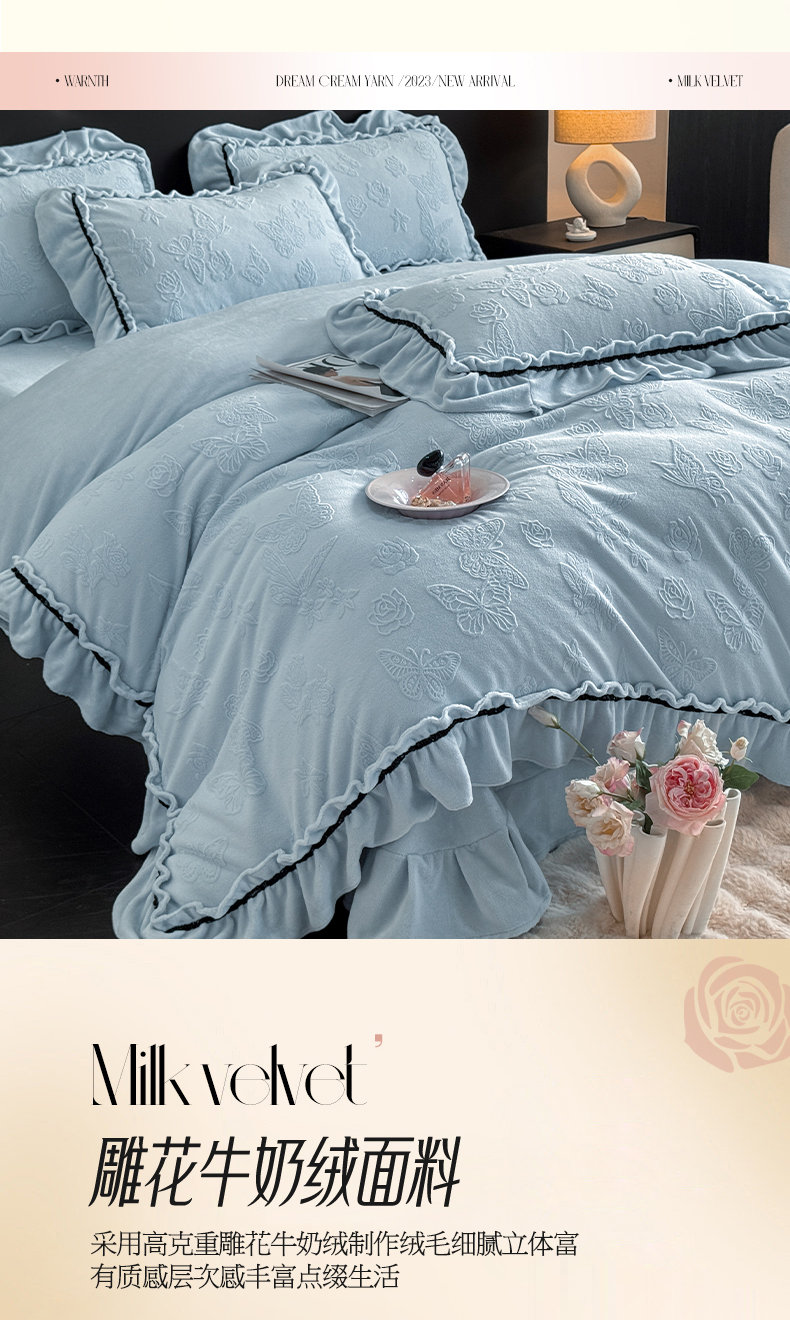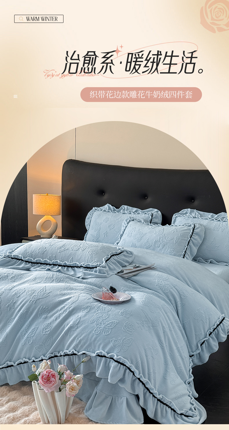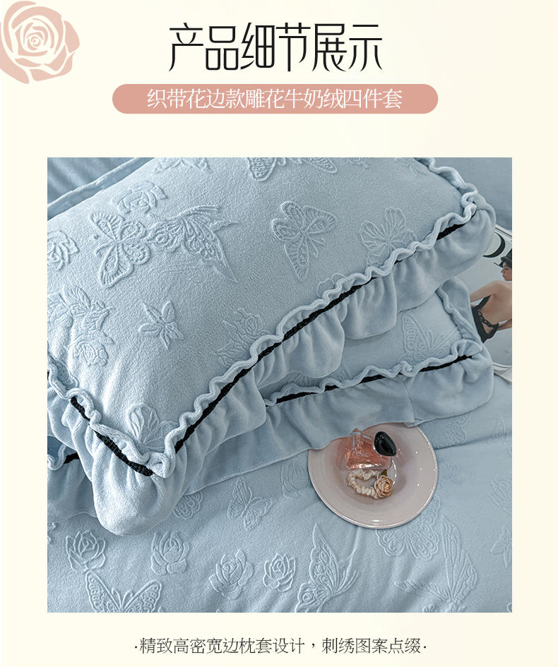 商品名称:绘萱家居 2025新款新品爆款高密消光织带花边款雕花牛奶绒四件套 香蝶-兰