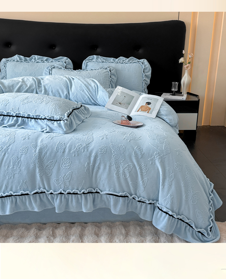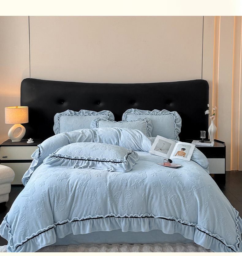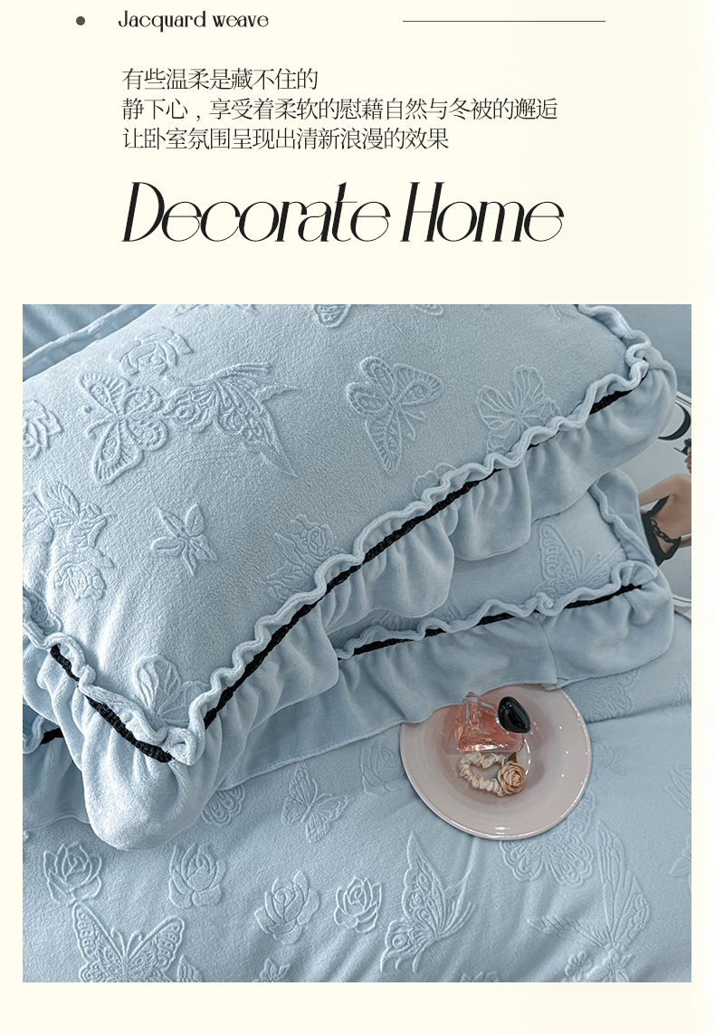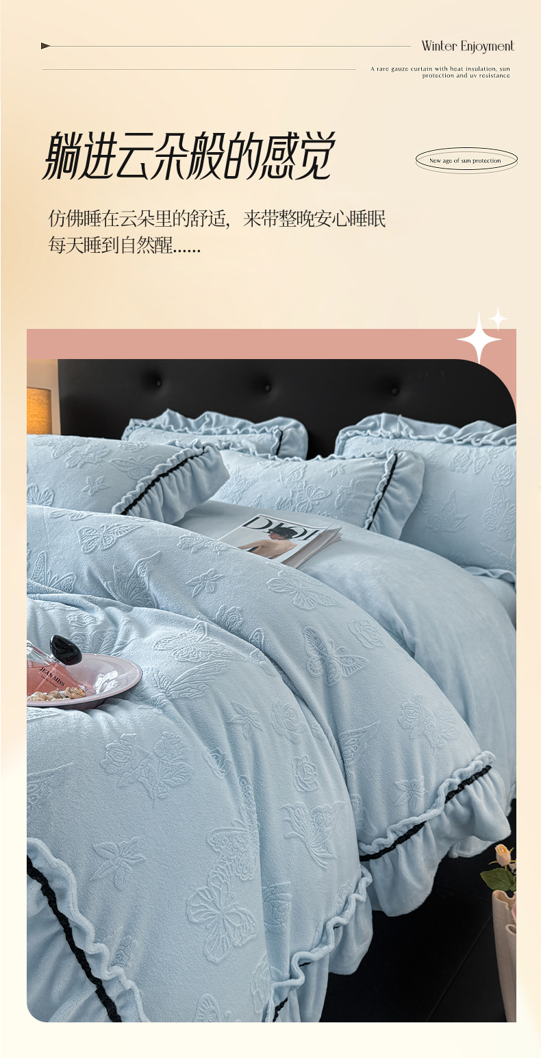 商品名称:绘萱家居 2025新款新品爆款高密消光织带花边款雕花牛奶绒四件套 香蝶-兰