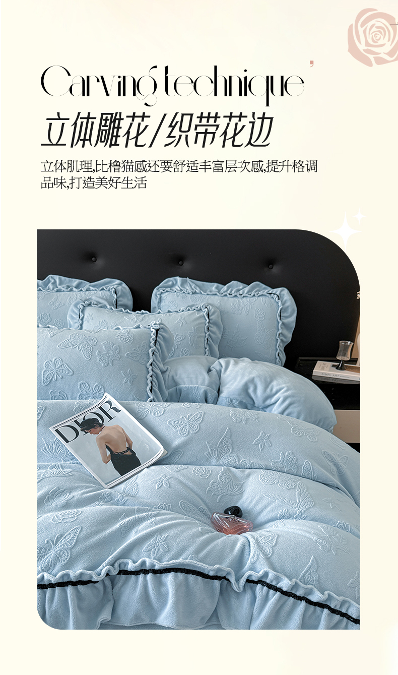 绘萱家居 2025新款新品爆款高密消光织带花边款雕花牛奶绒四件套 香蝶-兰