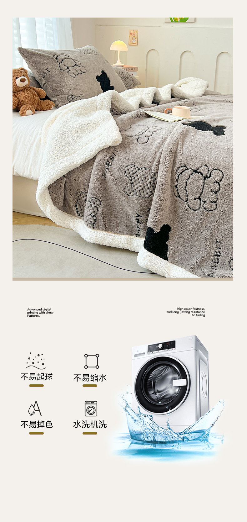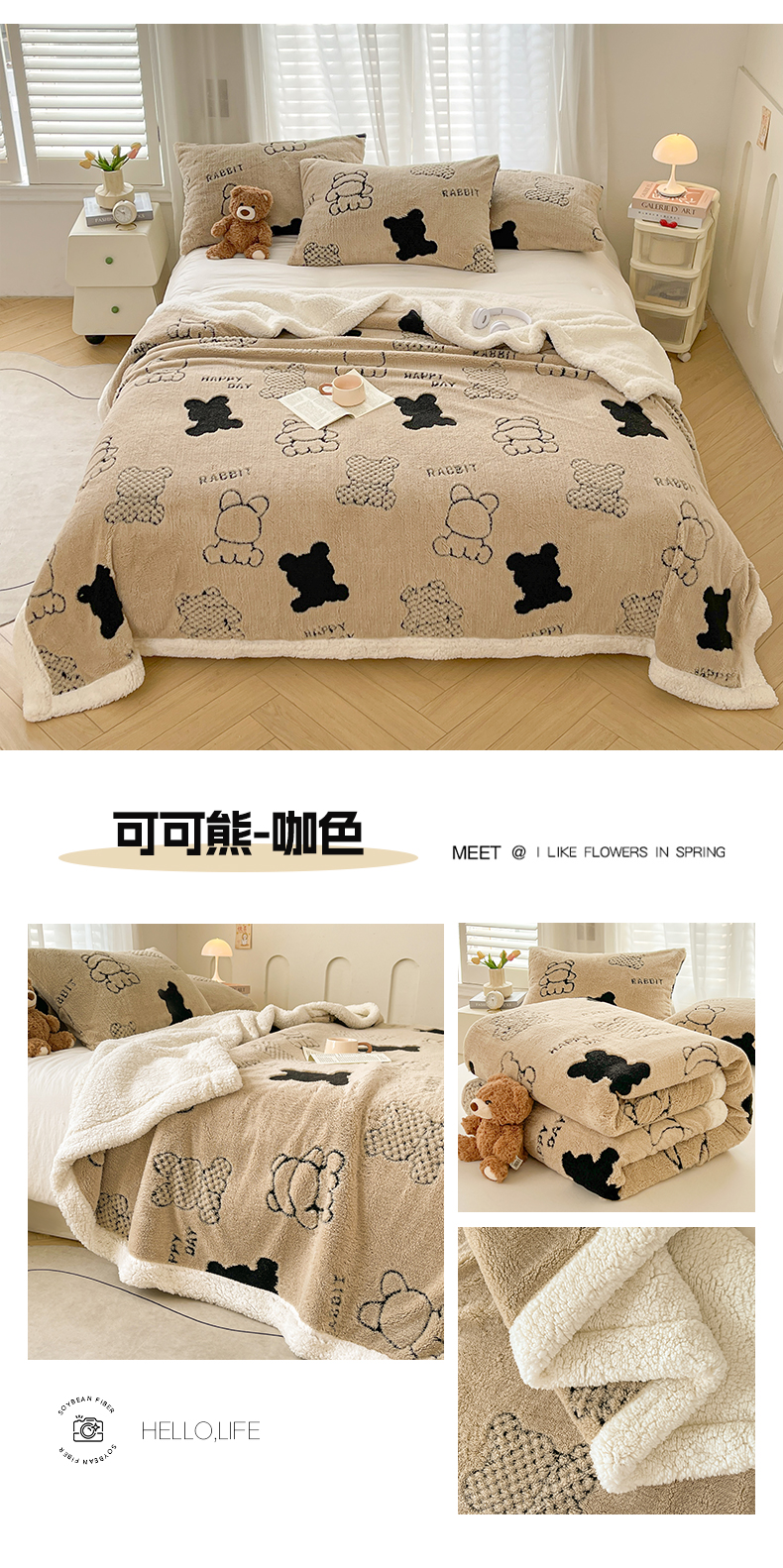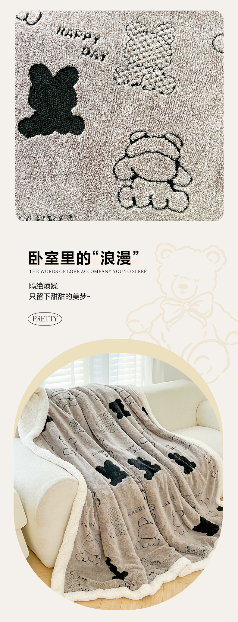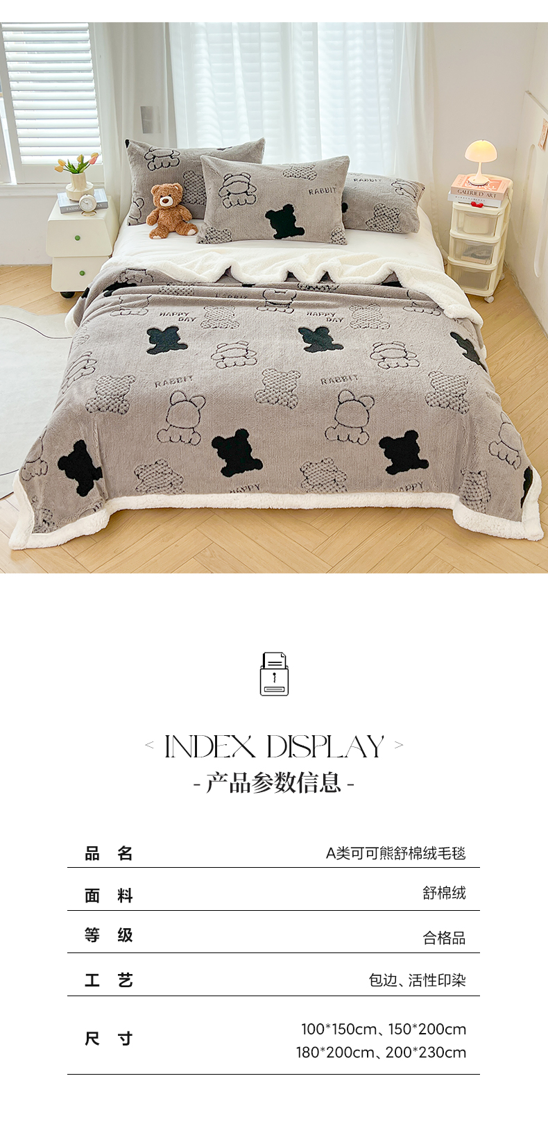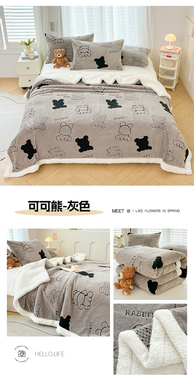 商品名称:欧邦 2025新款A类舒棉绒毛毯盖毯毯子-可可熊 可可熊-灰色