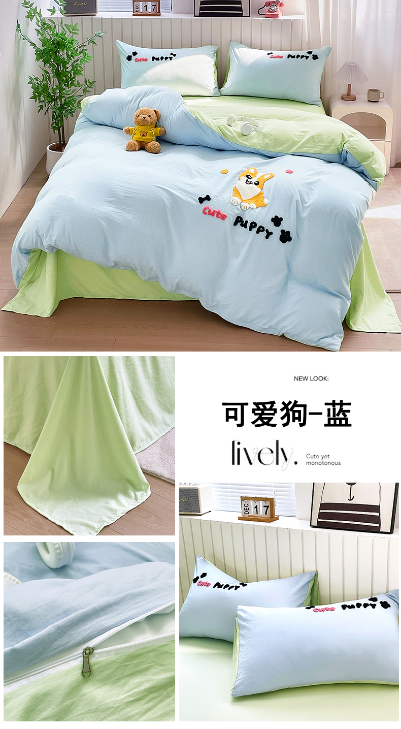 (总)三叁三 2025新款卡通毛巾绣云柔水洗棉四件套,饼于趴趴狗,好朋友,快乐雪纳瑞,淘气狗-花海,淘气狗-蓝格