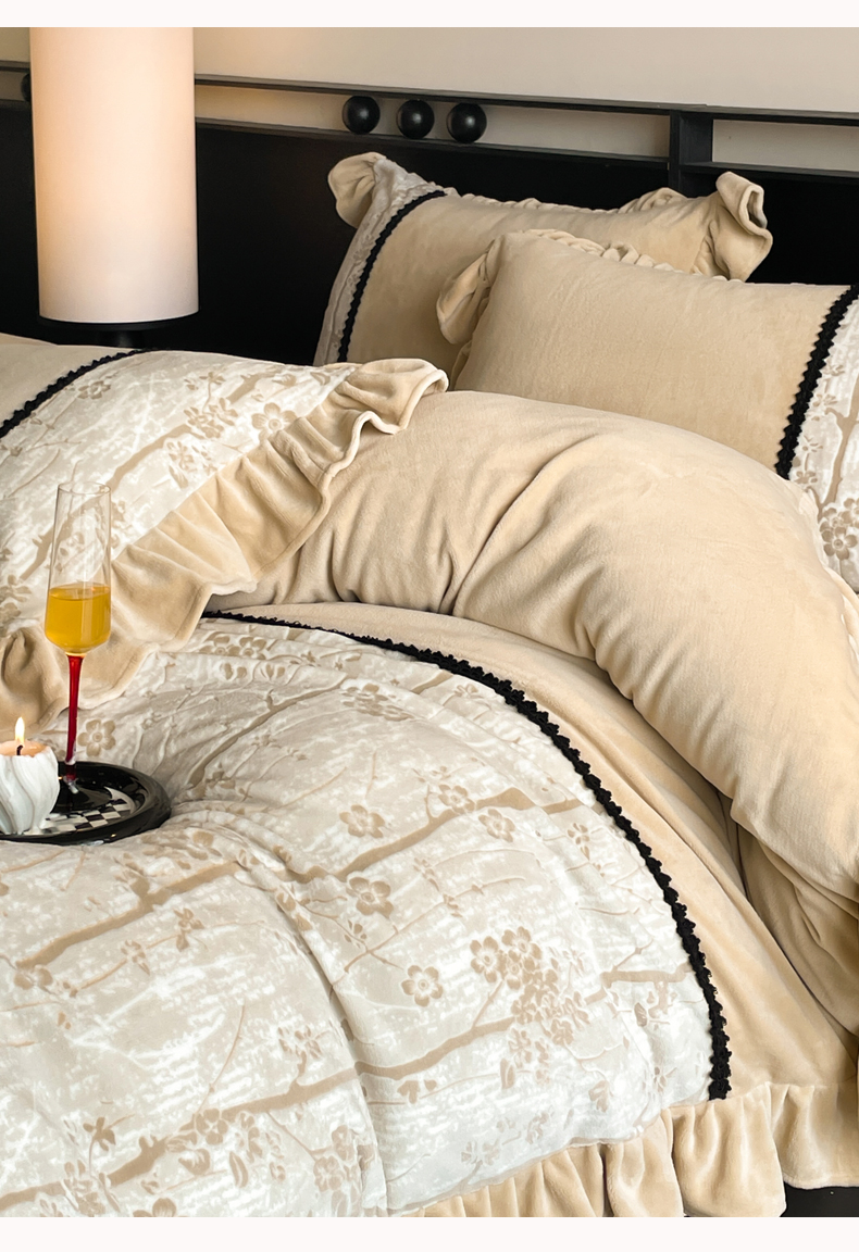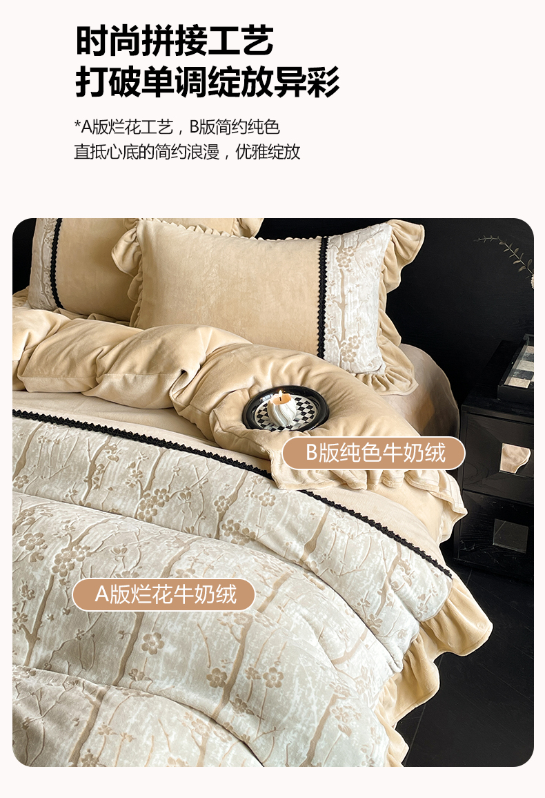 商品名称:慕木家纺 2025新款A类高克重高端雕花烂花AB版工艺款拼接四件套绮梦系列(直播热款) 浅梦絮语-咖