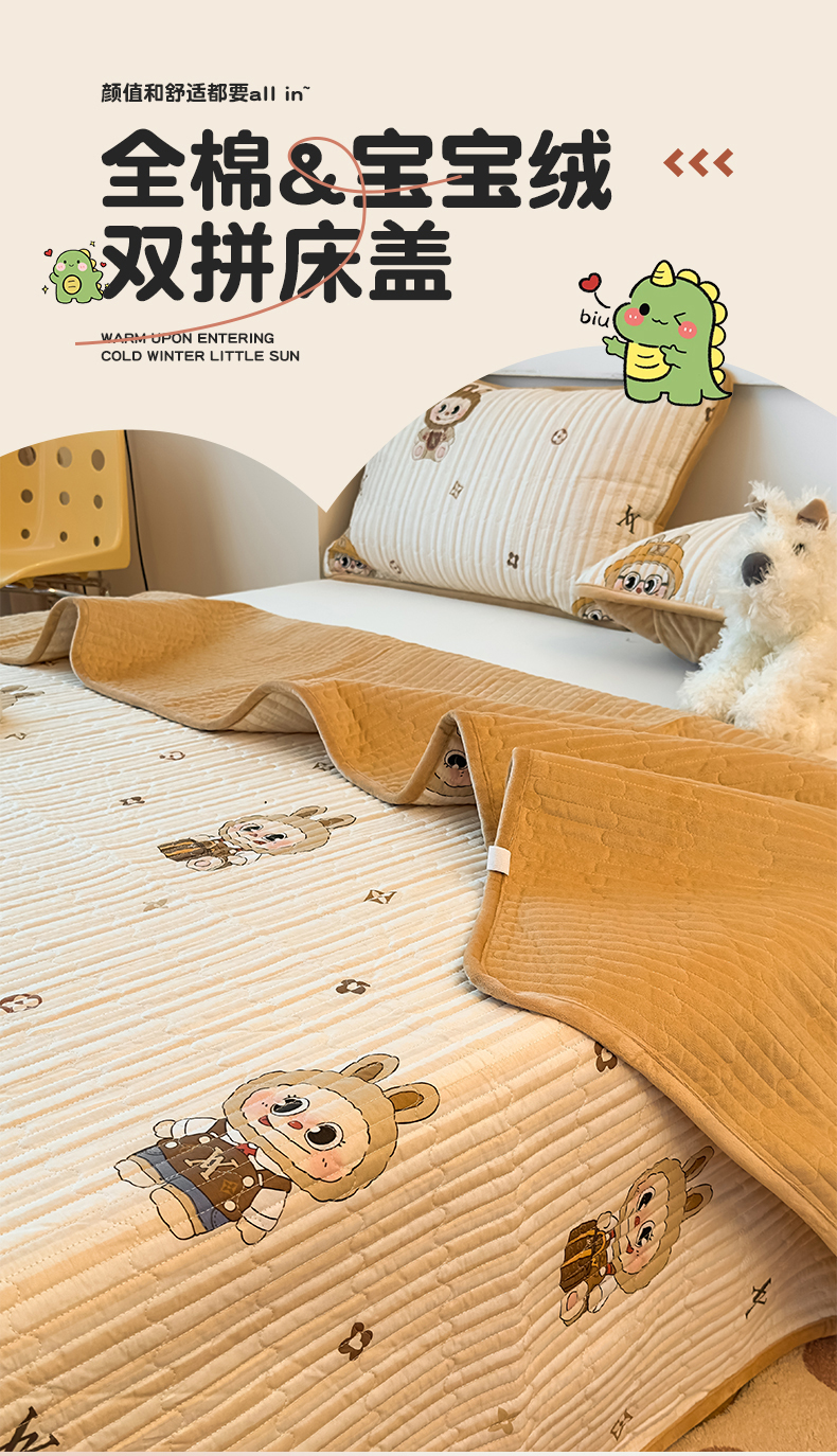 恒爱家纺 2025新款全棉宝宝绒双拼床盖三件套 拉布布