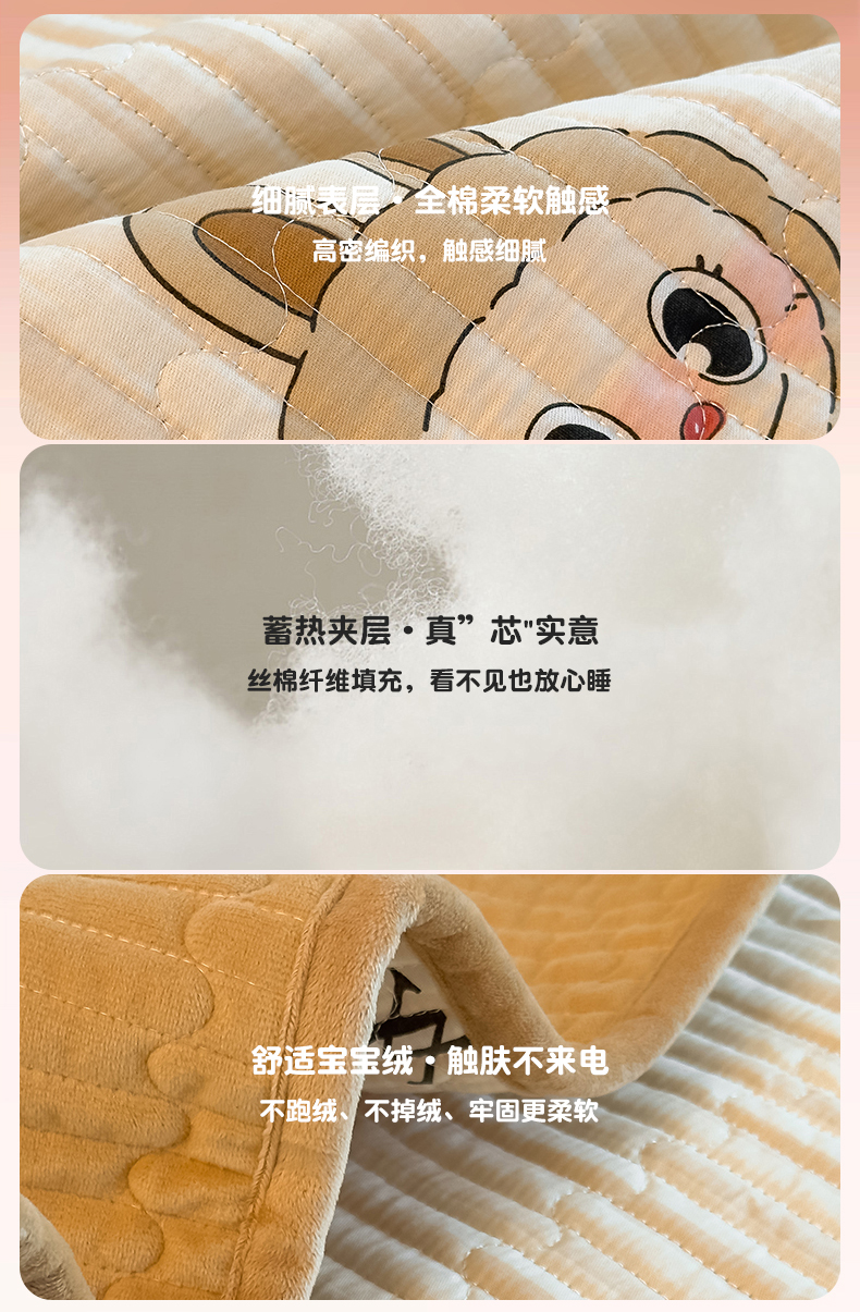 当前位置: 91家纺网 > 商品网购 > 床上用品 > 床盖 > 恒爱家纺 2025新款全棉宝宝绒双拼床盖三件套 拉布布