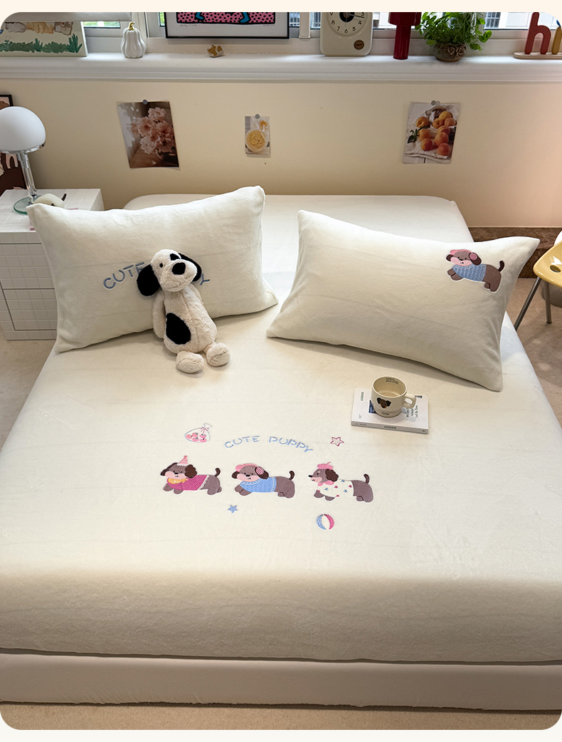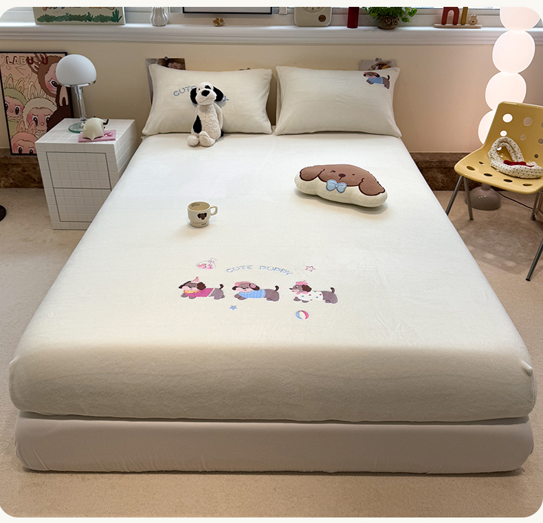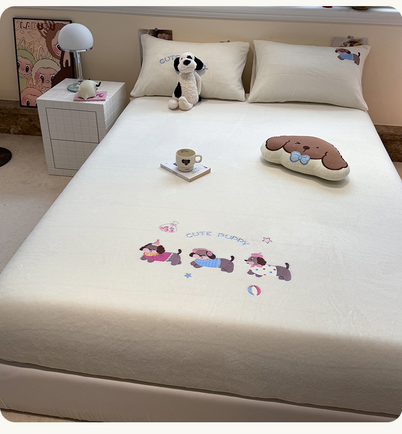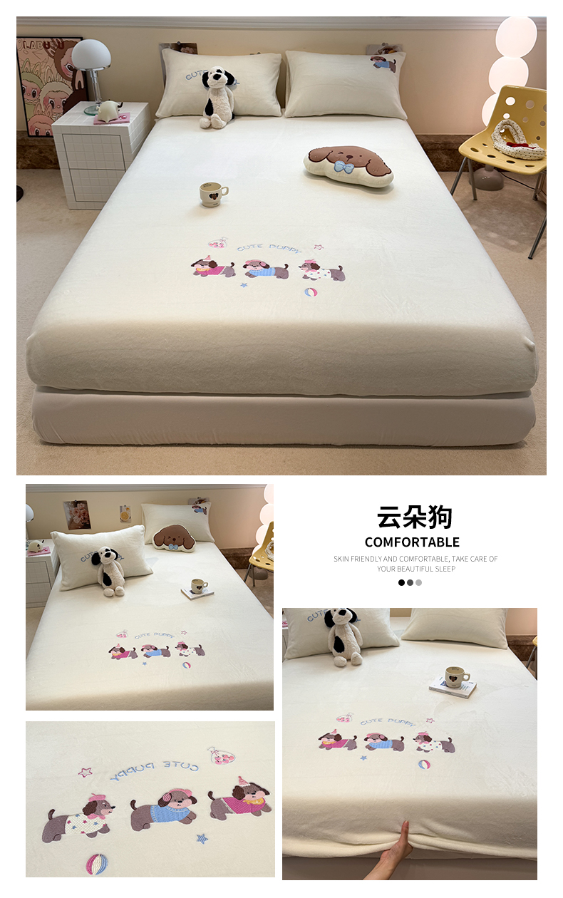 857家居 2025新款卡通牛奶绒刺绣床笠 云朵狗
