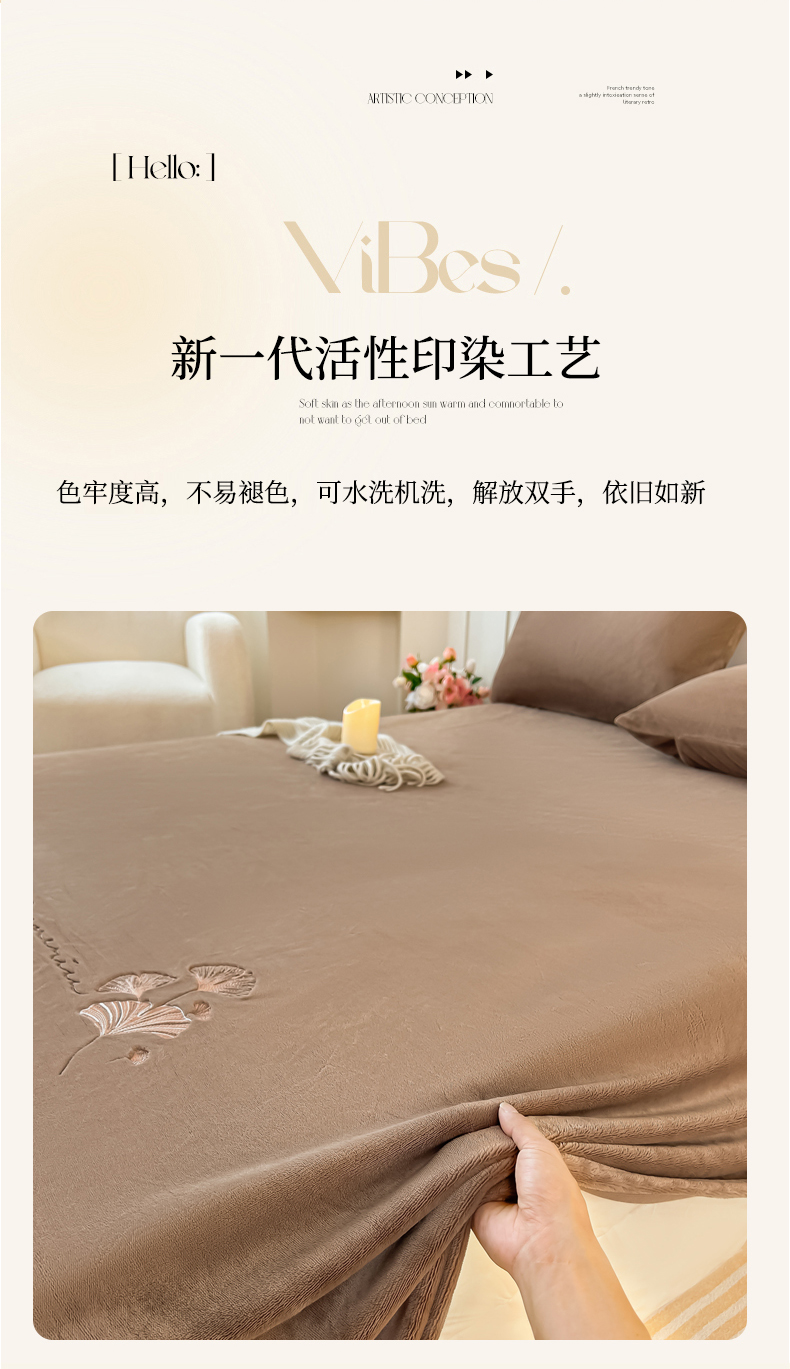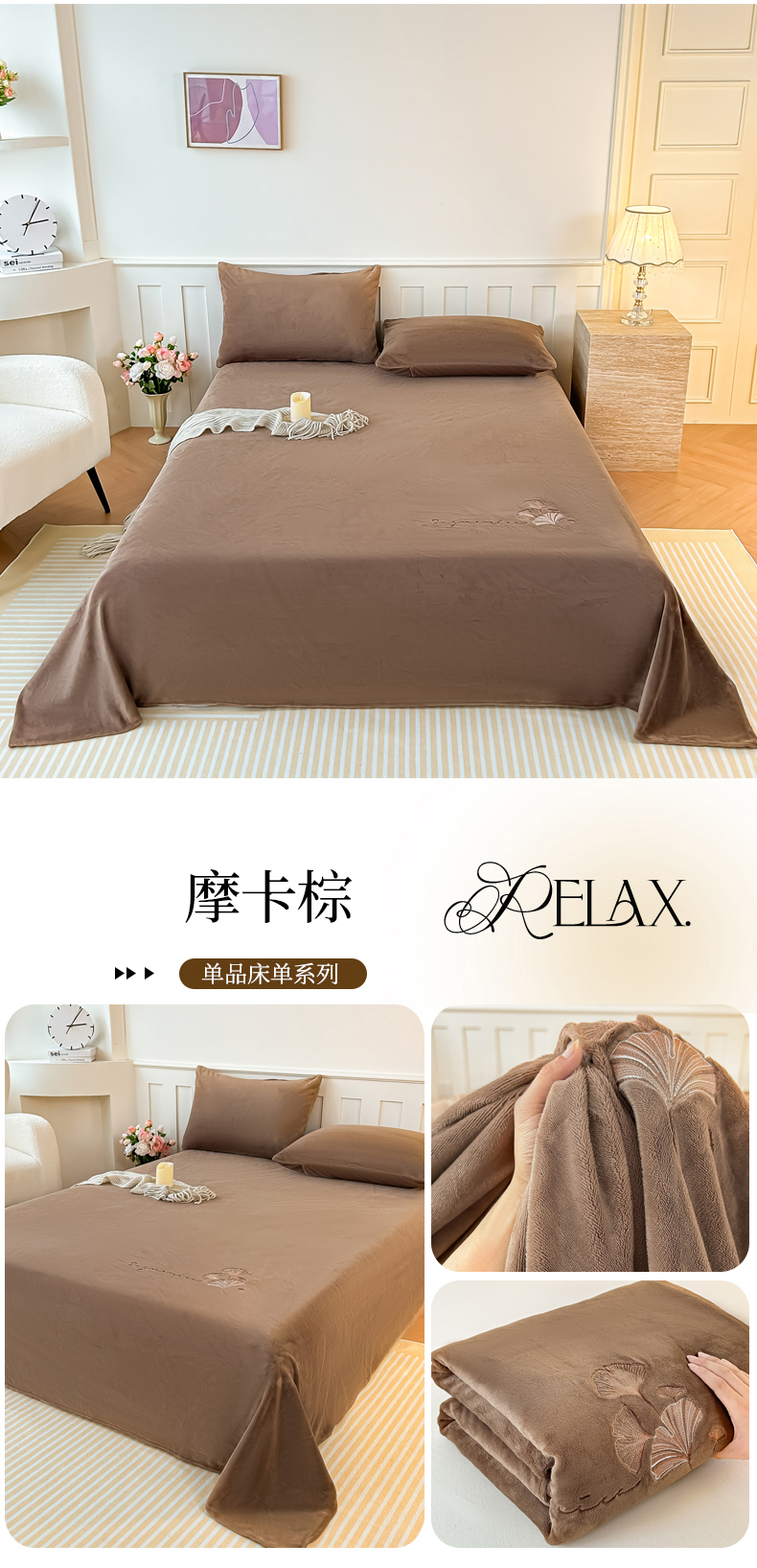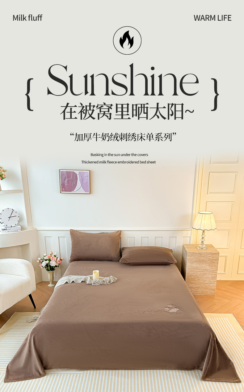 • 91家纺网 家纺一手货源 找家纺 芙绣家纺 2025新款牛奶绒刺绣床单 摩卡棕