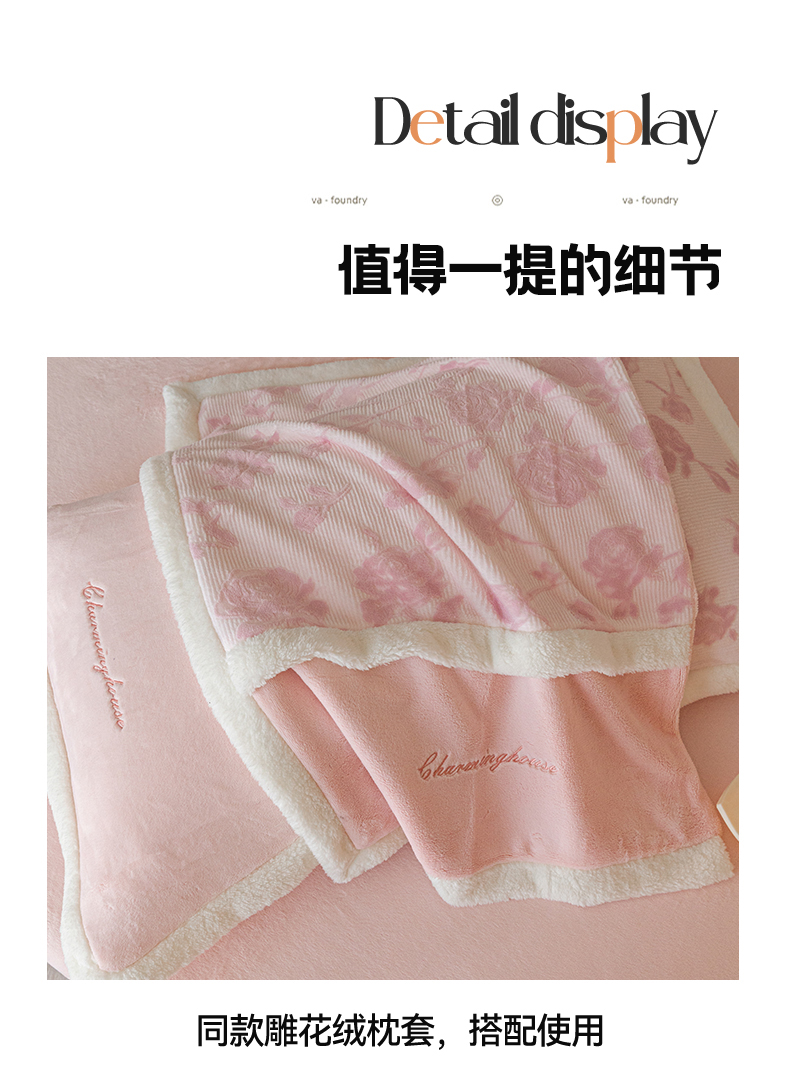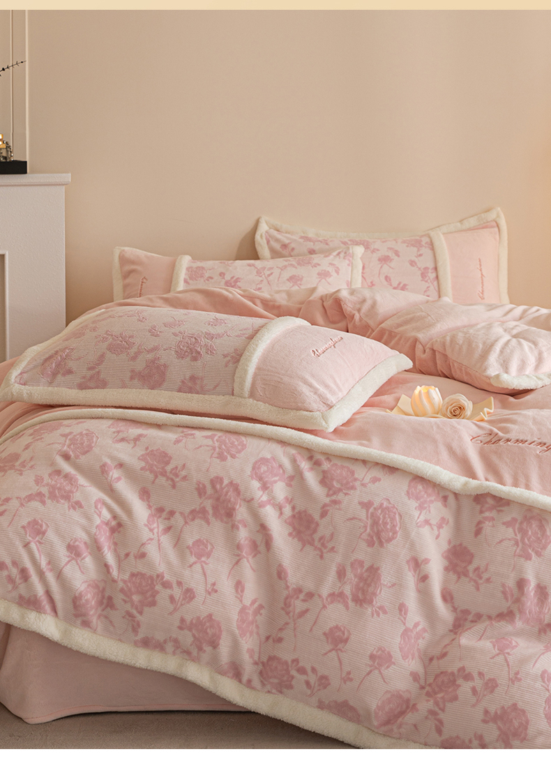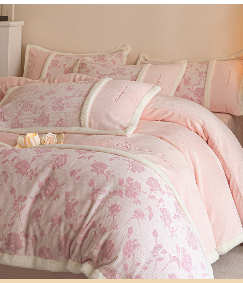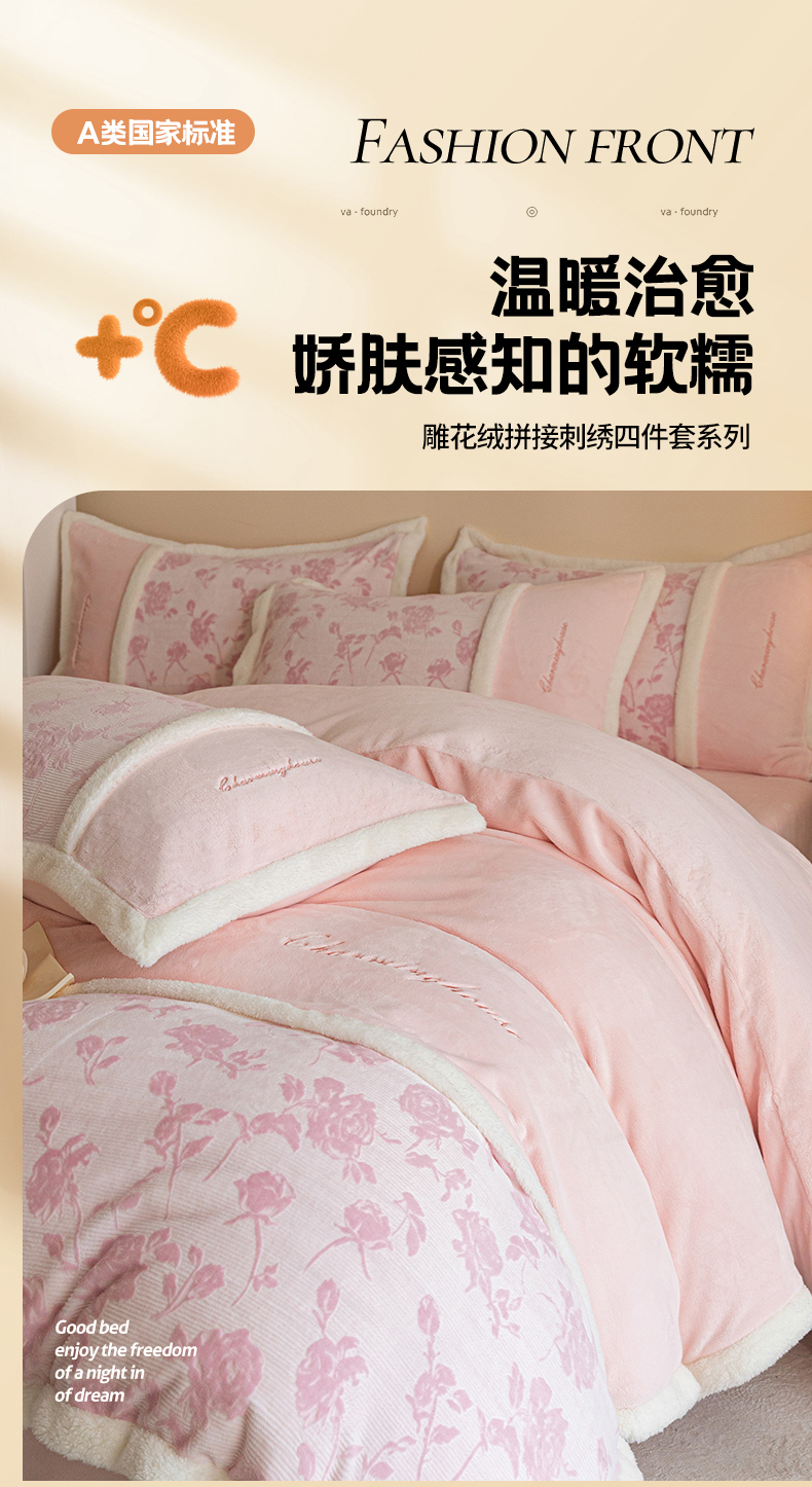 遇见家居生活馆 2025新款高克重雕花绒拼接刺绣四件套系列-艾菲妮 玫瑰-靓粉(深)
