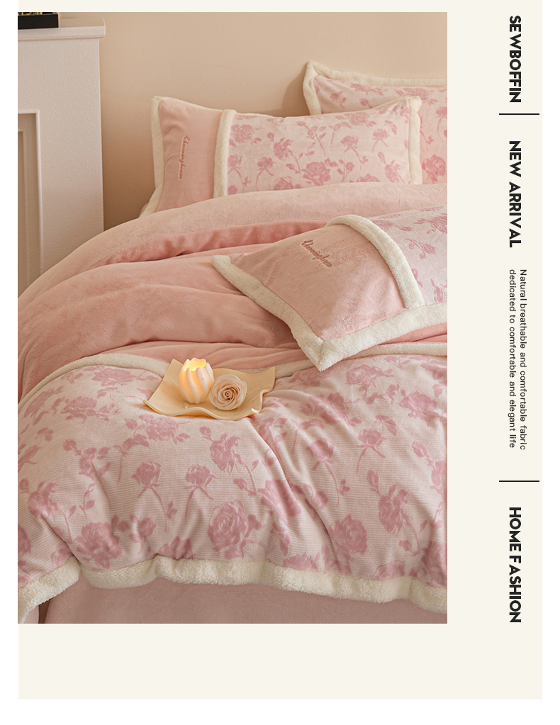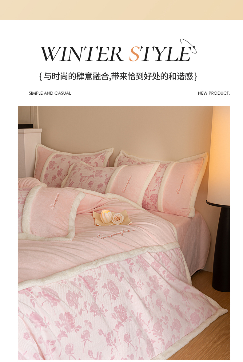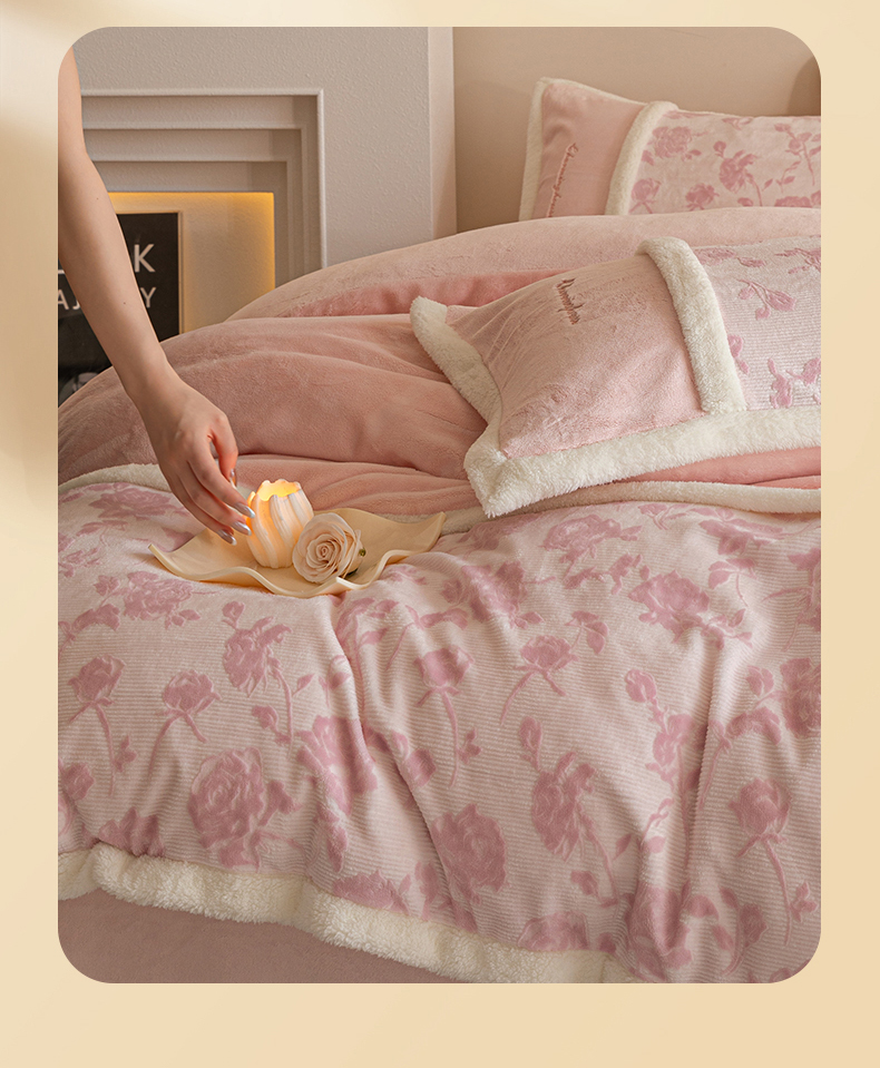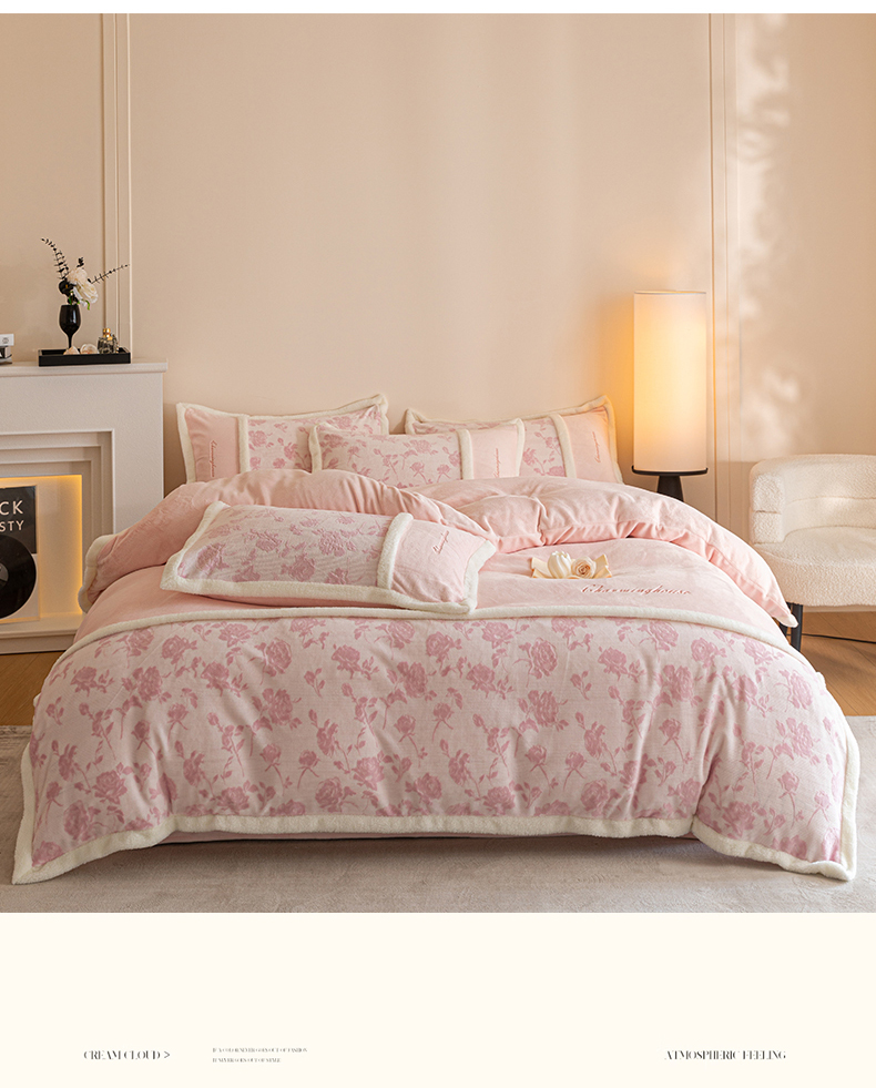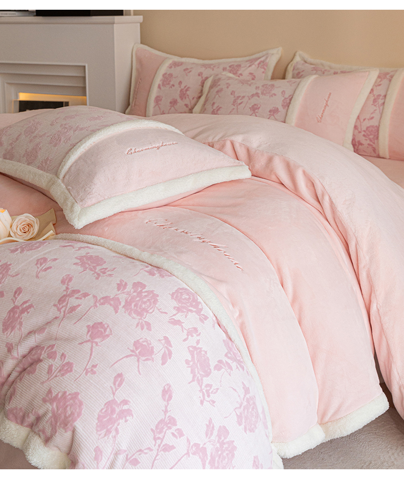 遇见家居生活馆 2025新款高克重雕花绒拼接刺绣四件套系列-艾菲妮 玫瑰-靓粉(深)
