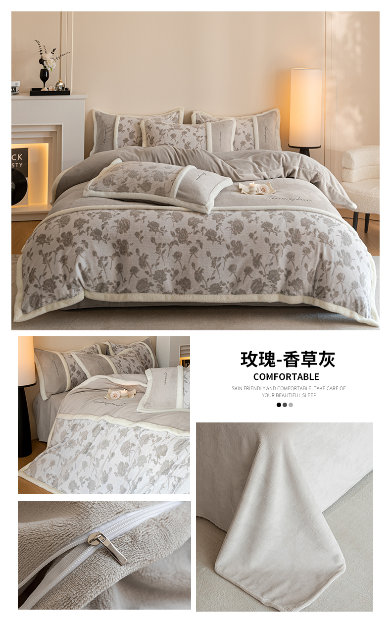 (总)遇见家居生活馆 2025新款A类牛奶绒雕花四件套-羽飞舞,卡诺粉+香槟,奶芋色+经典灰,奶芋色+杏仁,香草灰+经典灰,婴儿蓝+星辰灰