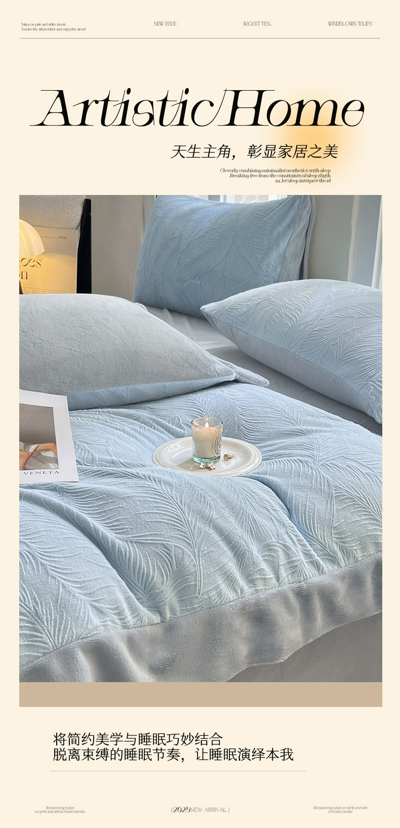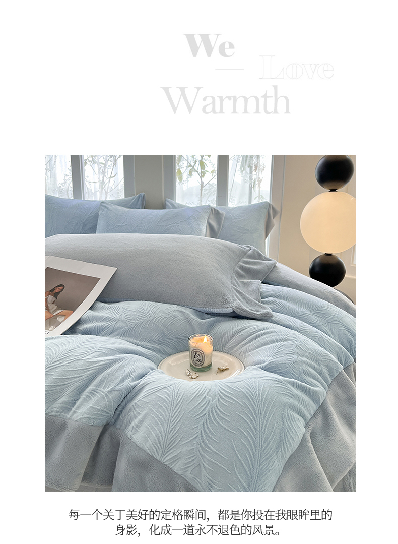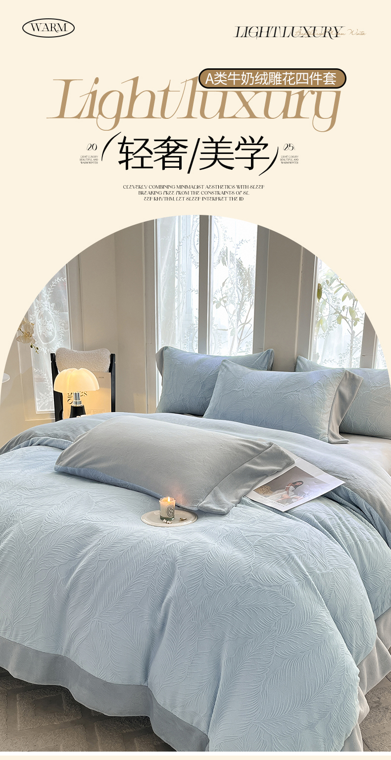 (总)遇见家居生活馆 2025新款A类牛奶绒雕花四件套-羽飞舞,卡诺粉+香槟,奶芋色+经典灰,奶芋色+杏仁,香草灰+经典灰,婴儿蓝+星辰灰