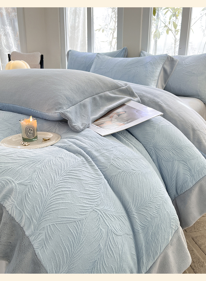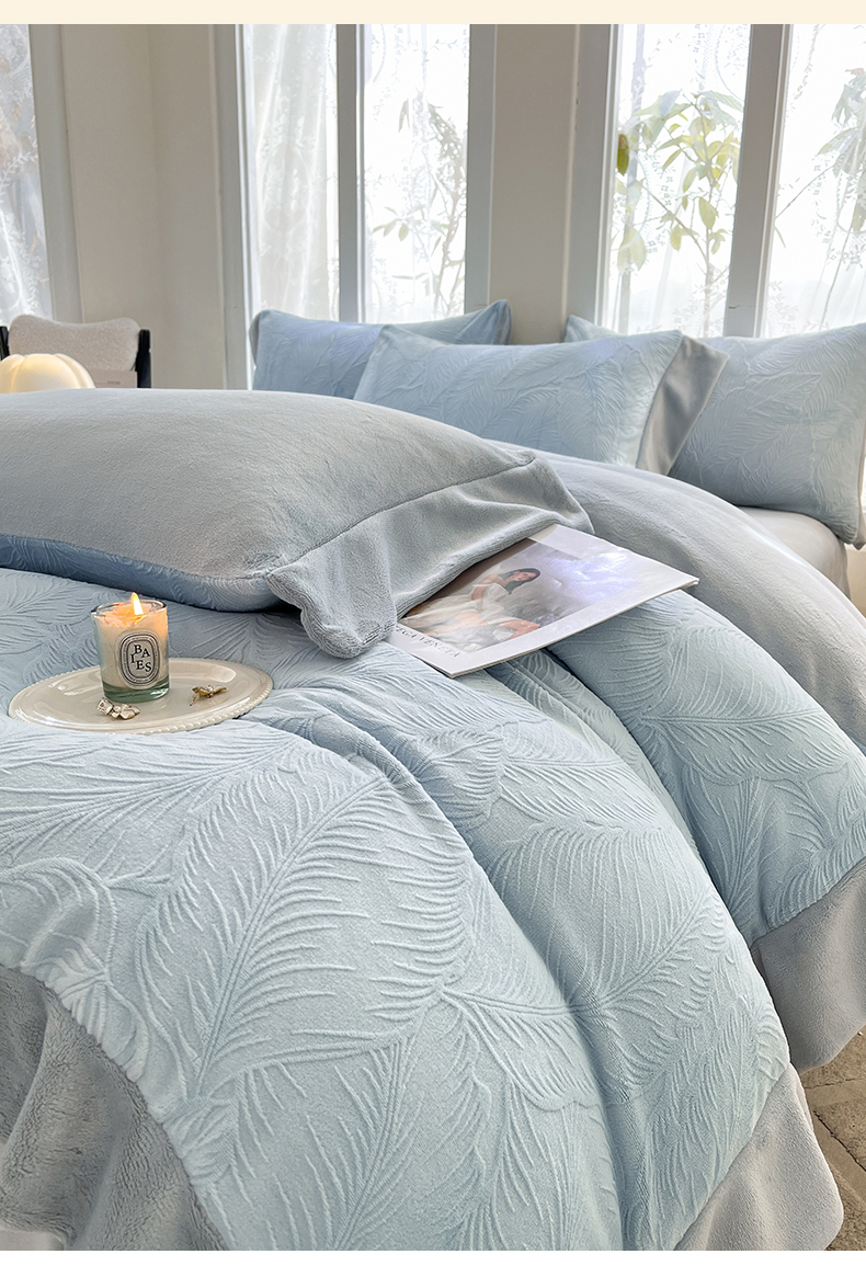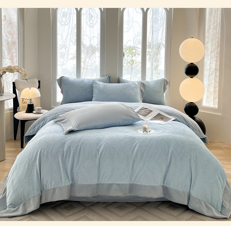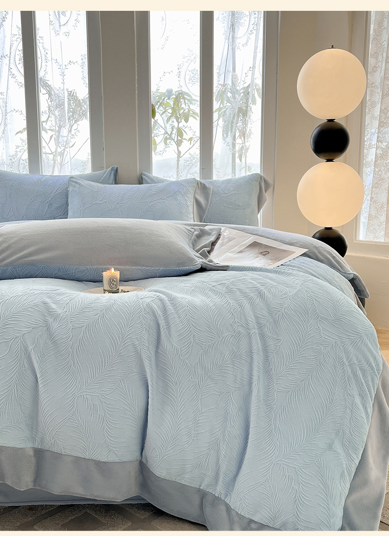 遇见家居生活馆 2025新款A类牛奶绒雕花四件套-羽飞舞 婴儿蓝+星辰灰