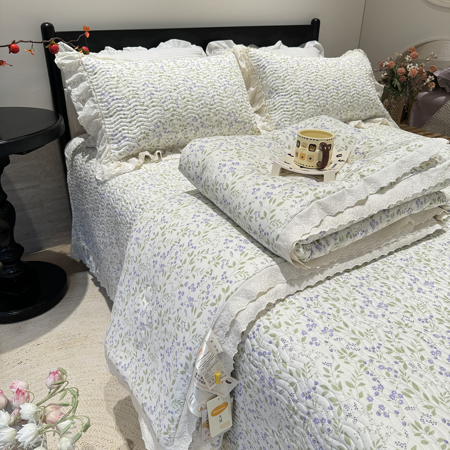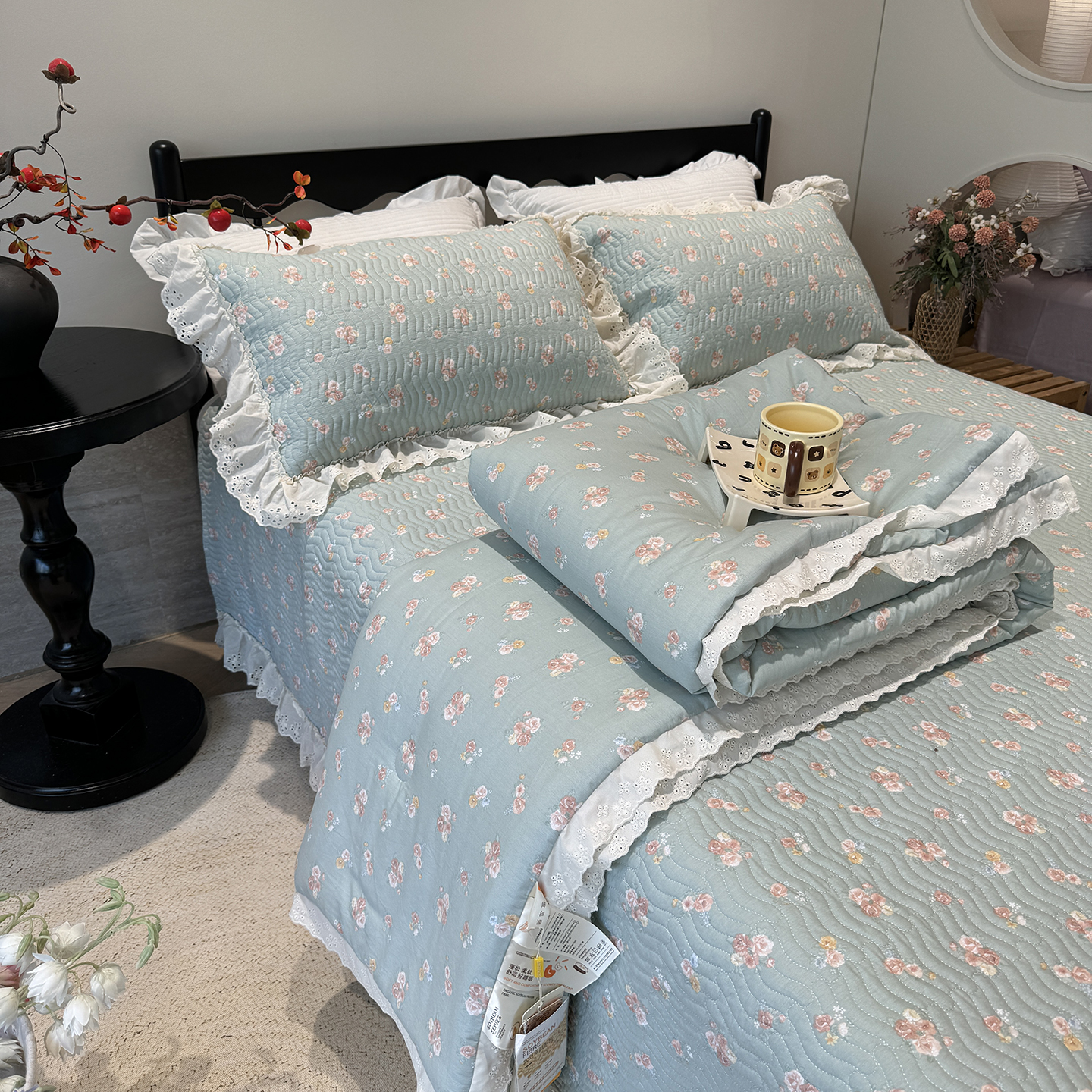 奈萝家纺 2025新款全棉蕾丝花边被套春秋被床盖四件套床盖三件套 沐辰花绿