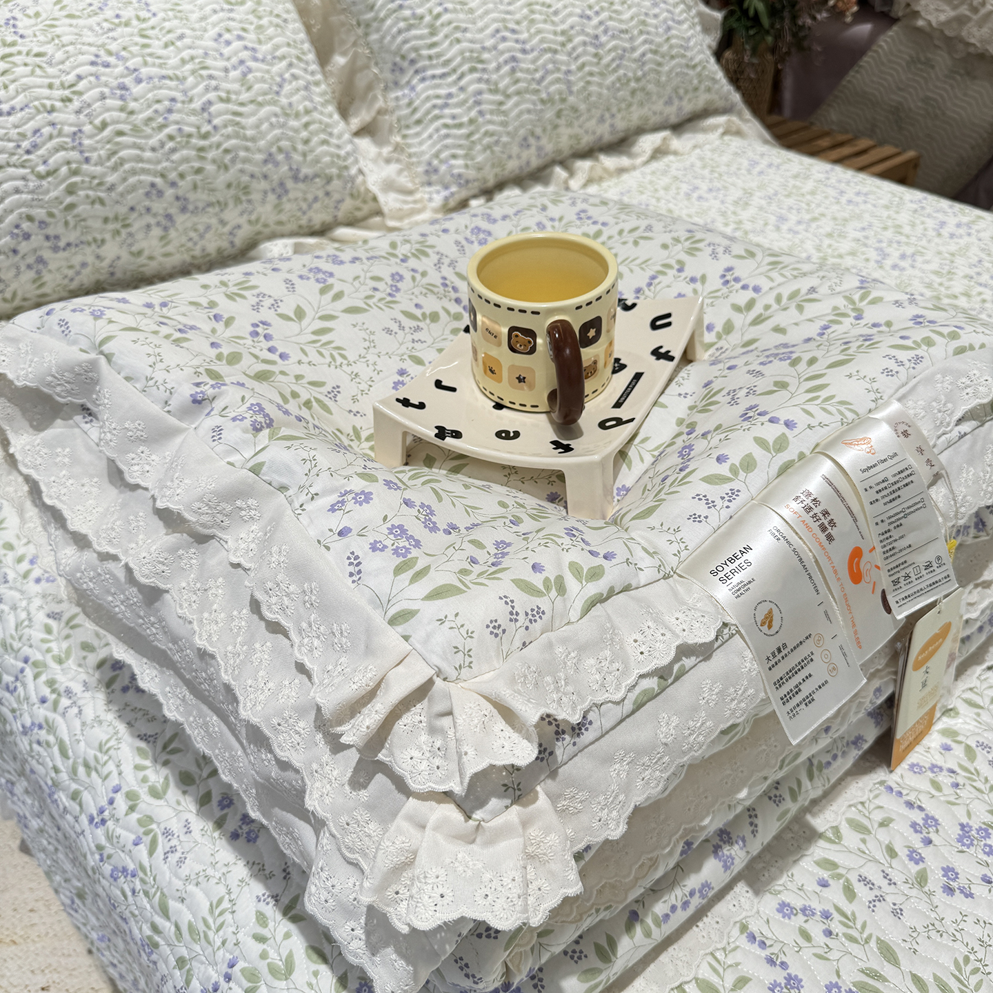 商品名称:奈萝家纺 2025新款全棉蕾丝花边被套春秋被床盖四件套床盖三件套 沐辰花绿