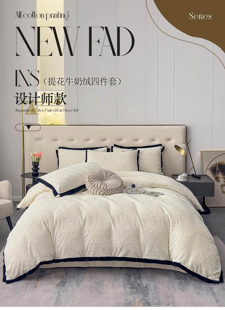 (总)好阁家纺 2025新款极简小香风雕花牛奶绒黑边四件套-风格一,千鸟格,山茶花,亚历山大,维多利亚
