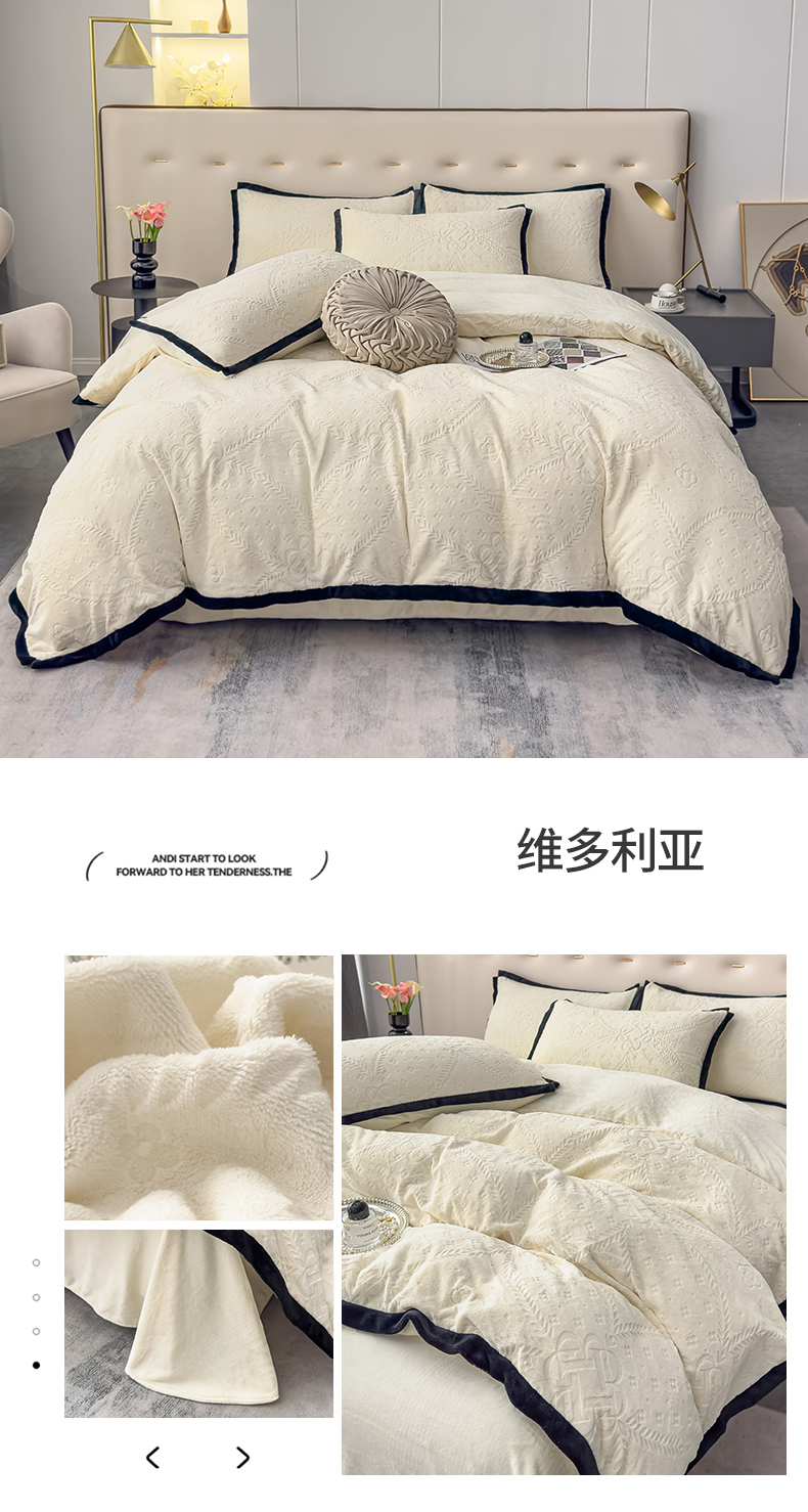 商品名称:好阁家纺 2025新款极简小香风雕花牛奶绒黑边四件套-风格一 维多利亚