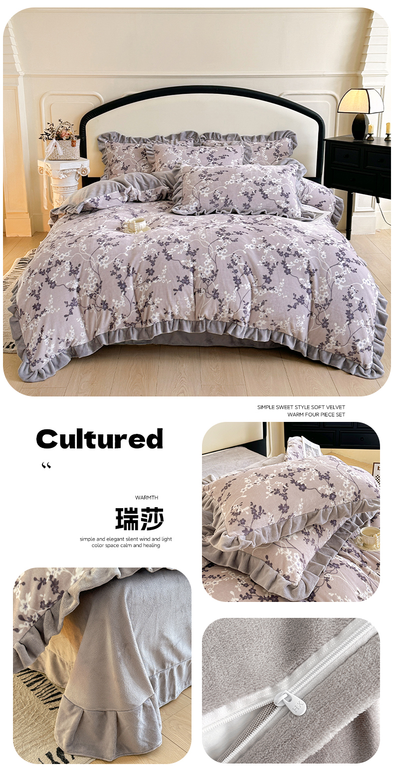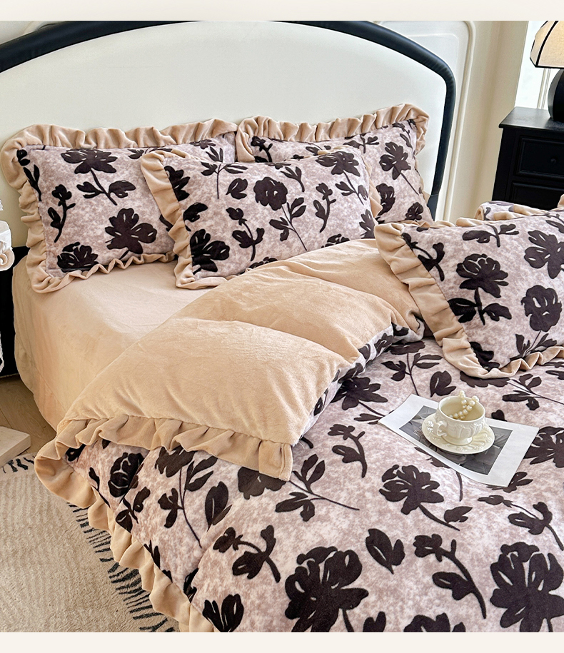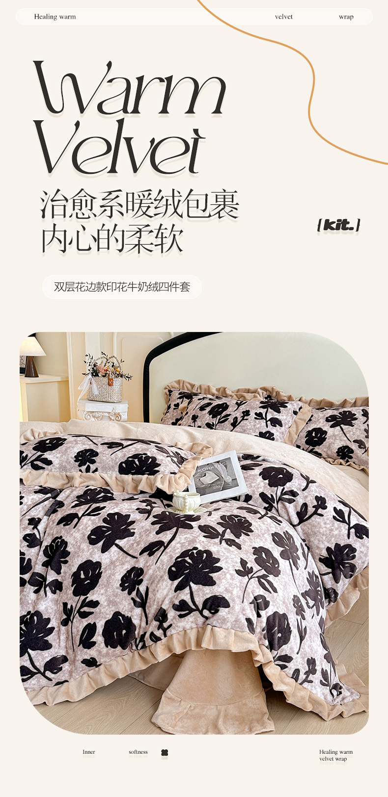 商品名称:绘萱家居 2025新款爆款高密消光双层花边牛奶绒四件套印花 蝶韵