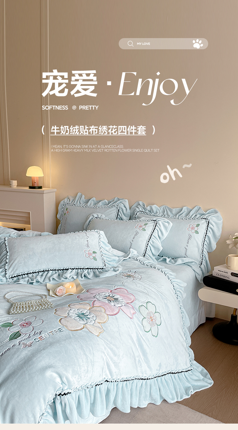 畅畅家纺 2025新款轻奢高档冬季工艺款牛奶绒毛巾绣床单床笠四件套 花韵-浅蓝
