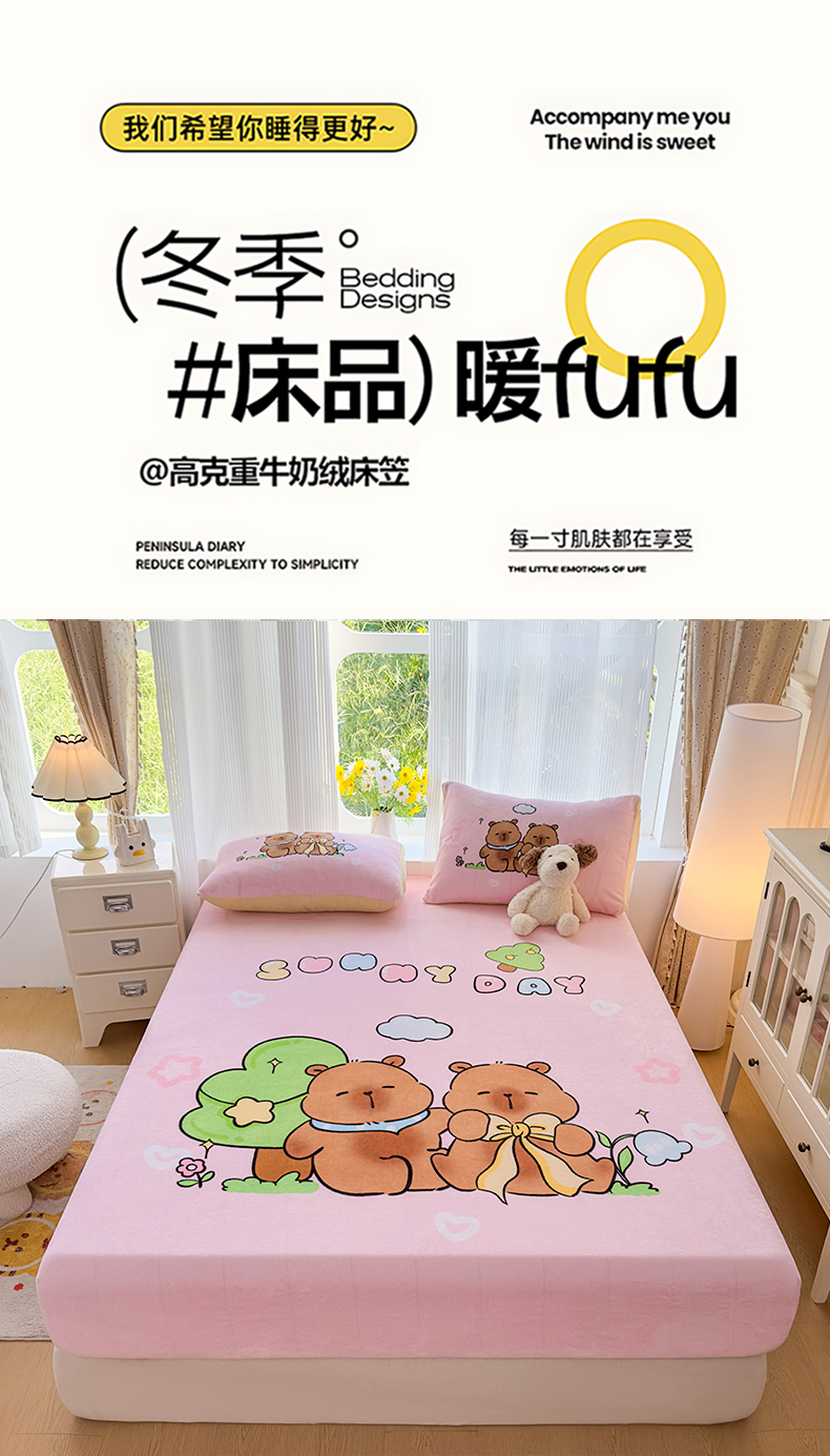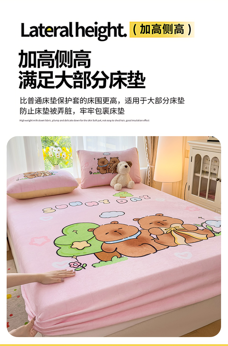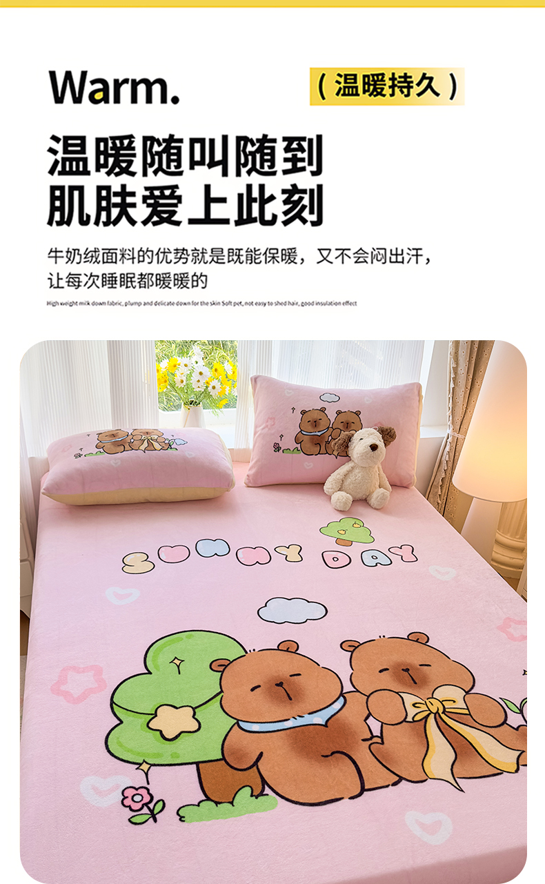 商品名称:浩诚 2025新款大版原创设计卡皮巴拉高克重牛奶绒单床笠 阳光巴拉
