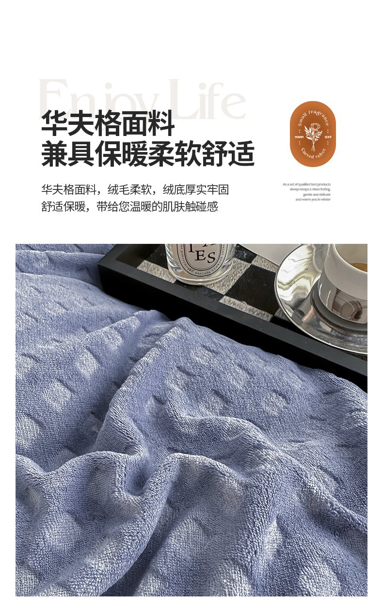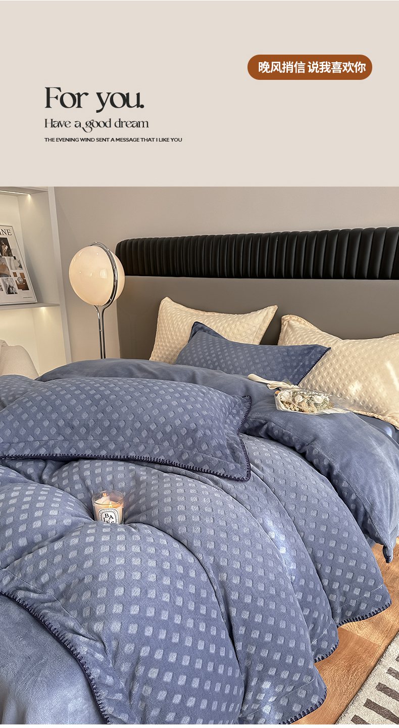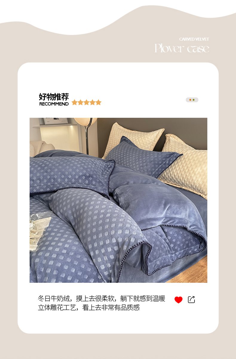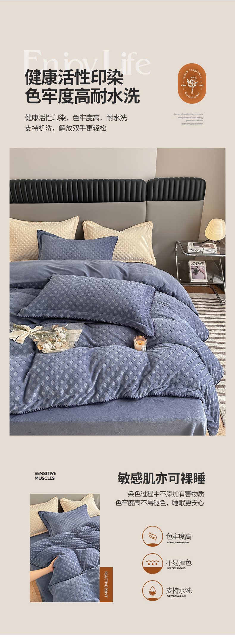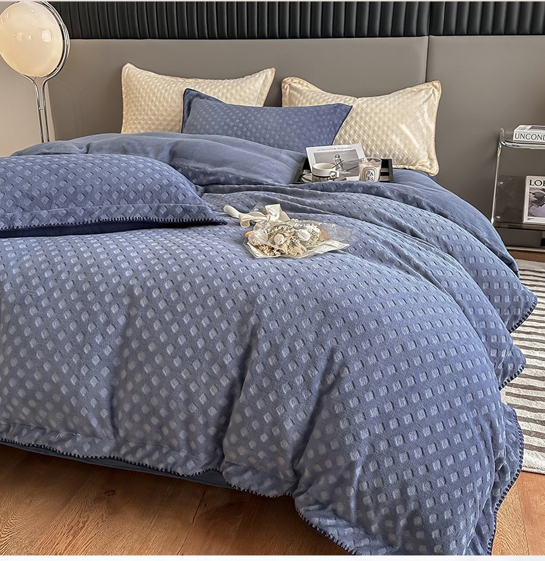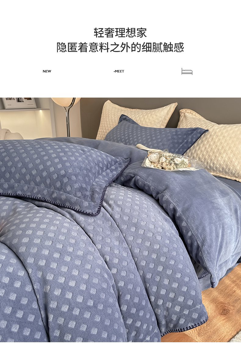 当前位置: 91家纺网 > 商品网购 > 床品套件 > 四件套 > 牛奶绒四件套 > 艾佳 2025新款华夫格高克重牛奶绒雕花三角贝壳边工艺加厚保暖四件套 华夫格星空蓝