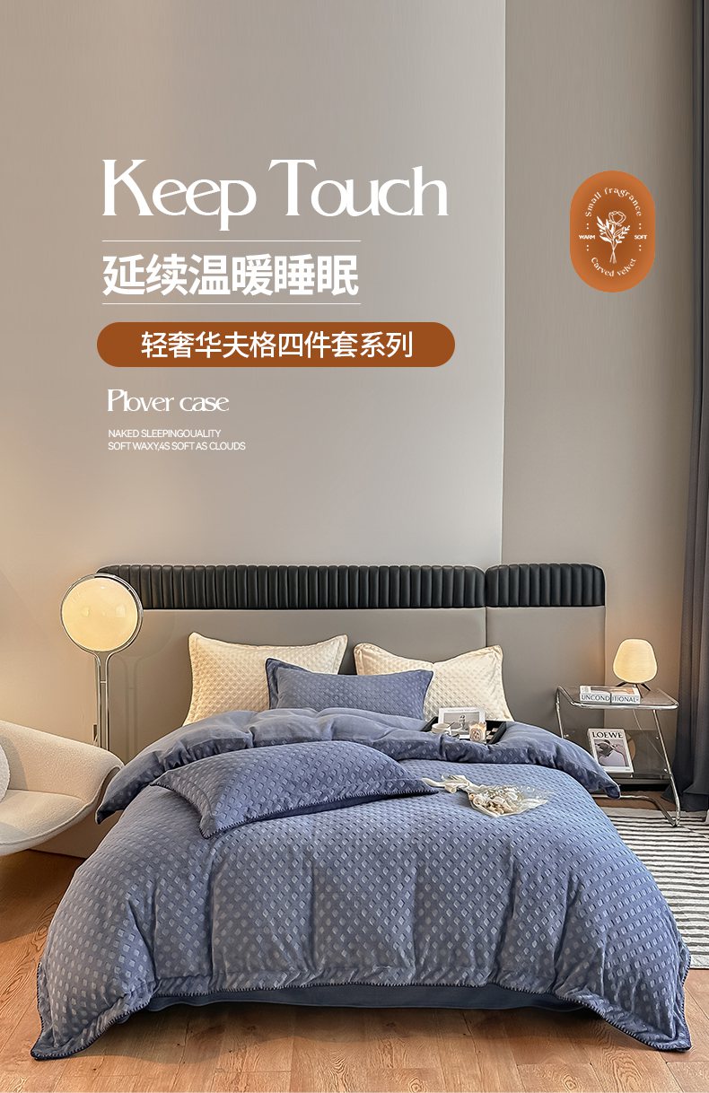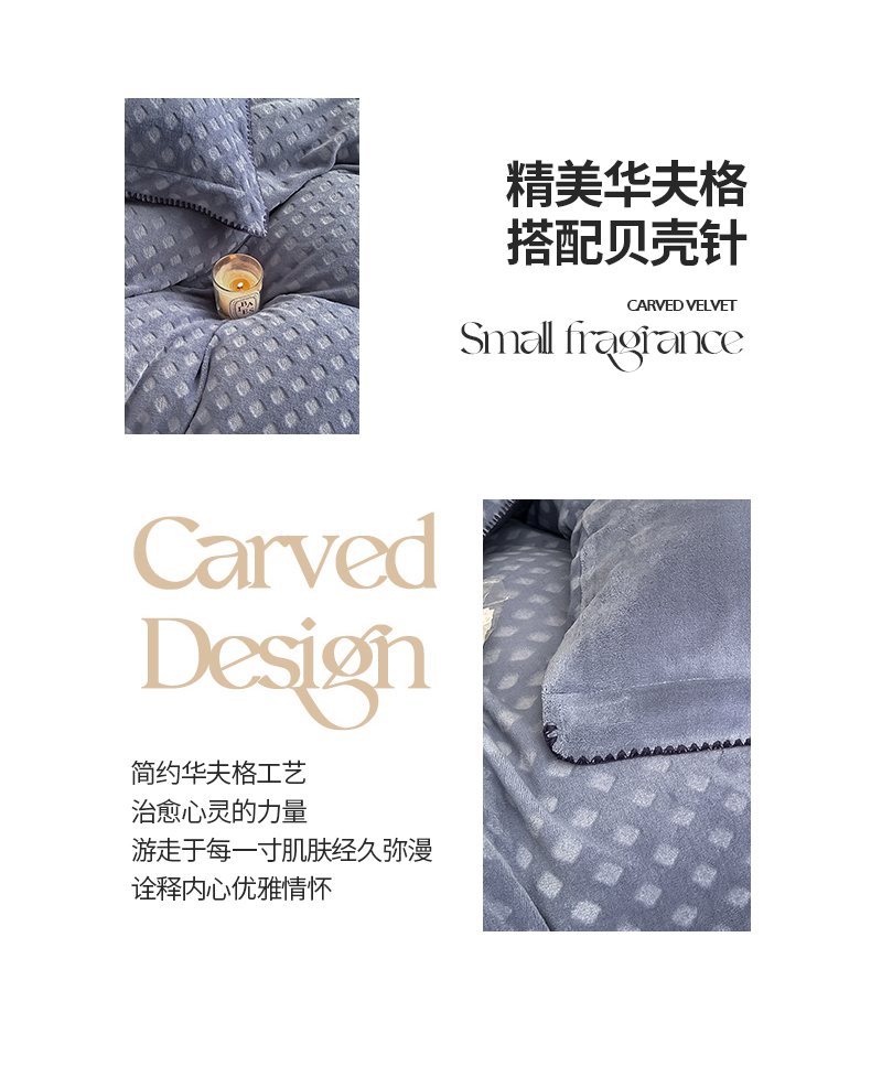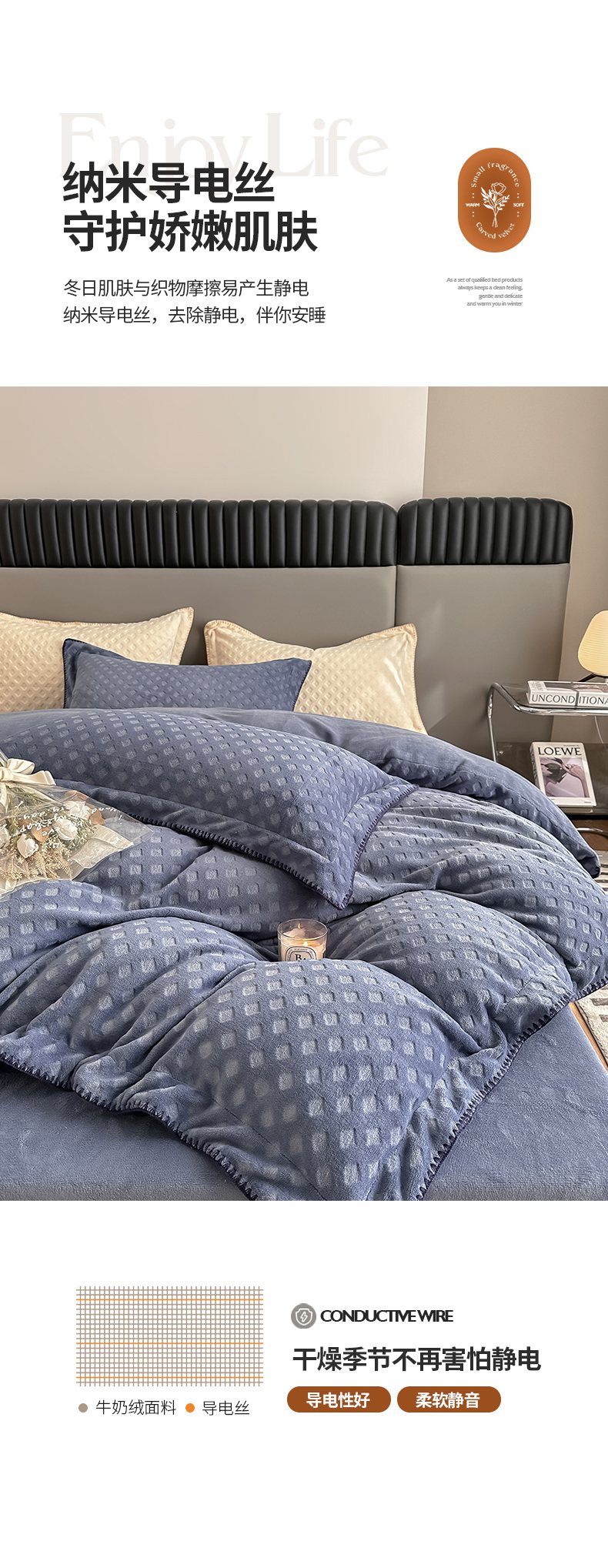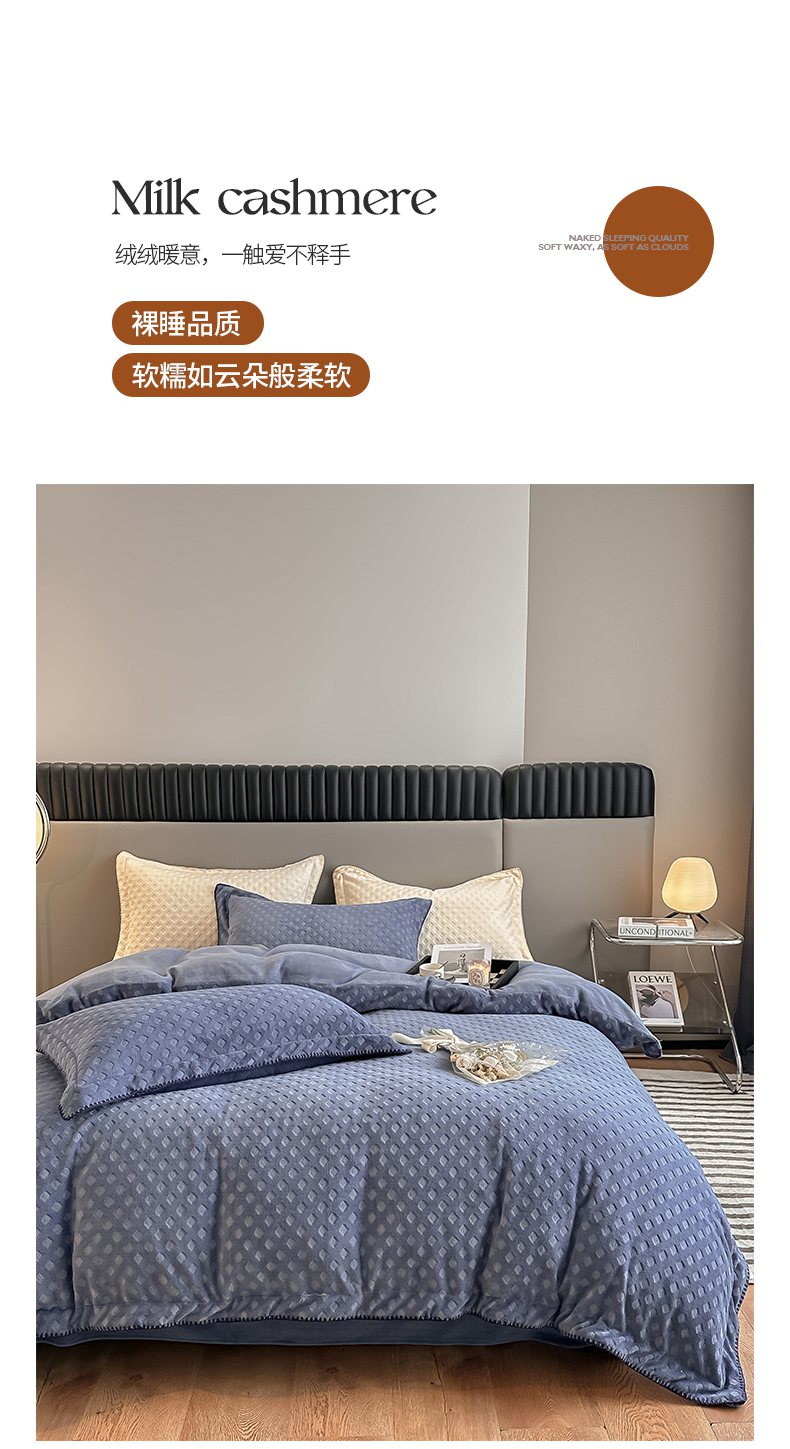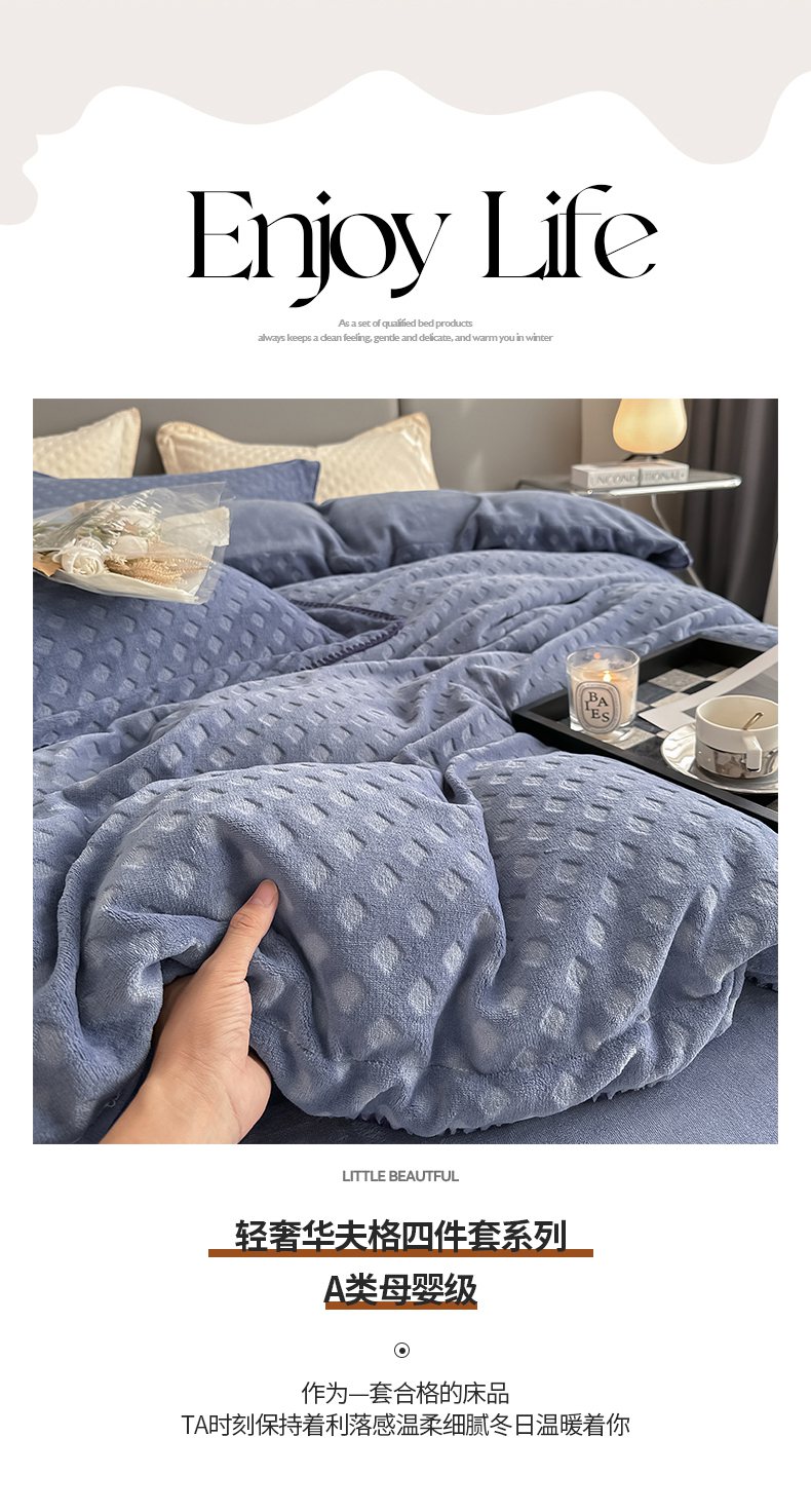 当前位置: 91家纺网 > 商品网购 > 床品套件 > 四件套 > 牛奶绒四件套 > 艾佳 2025新款华夫格高克重牛奶绒雕花三角贝壳边工艺加厚保暖四件套 华夫格星空蓝