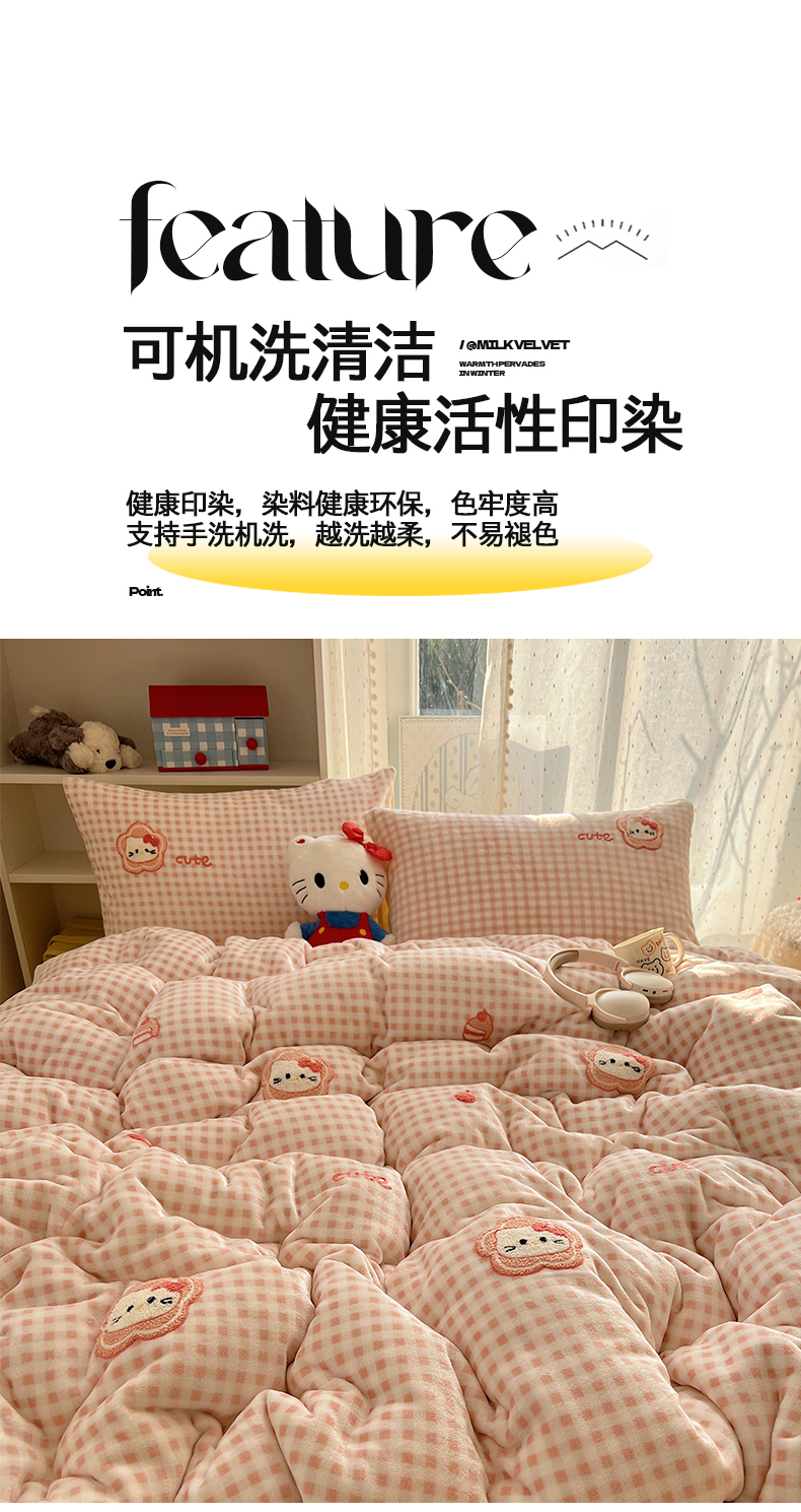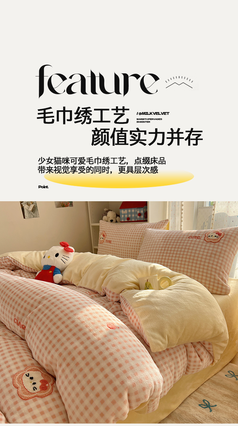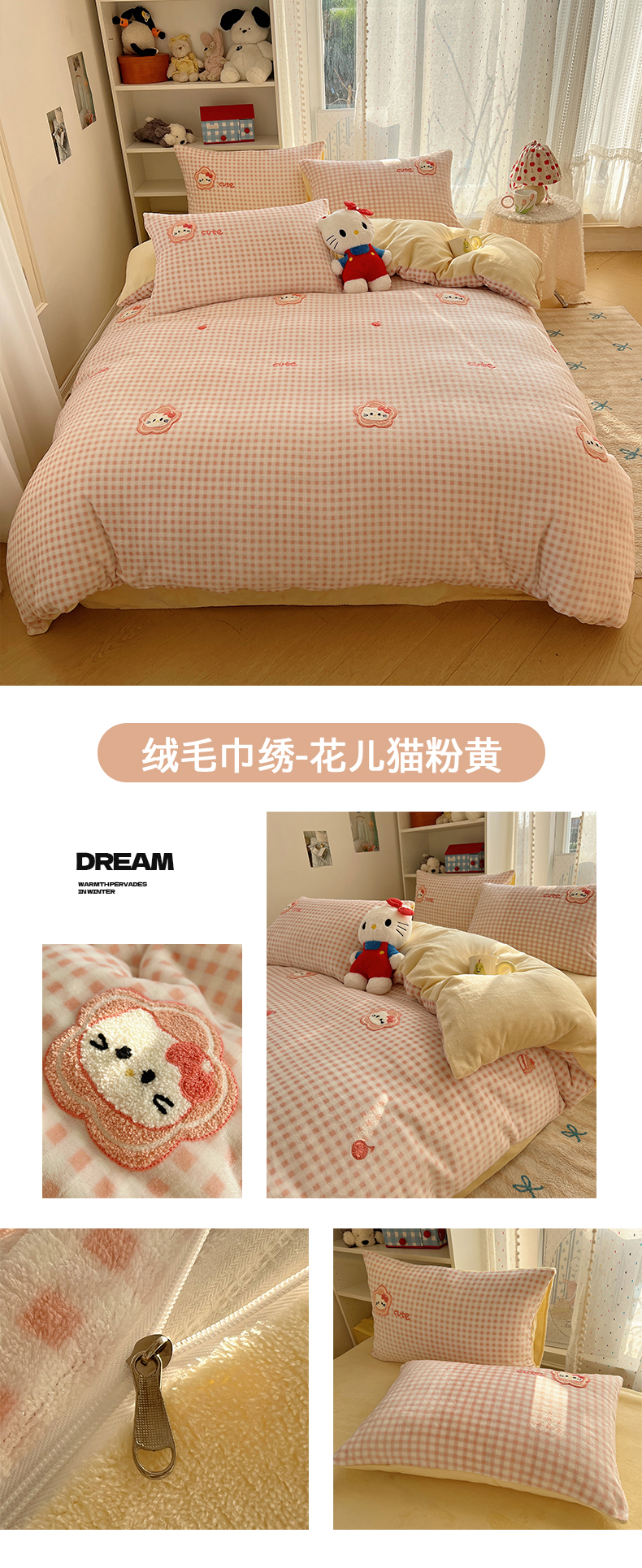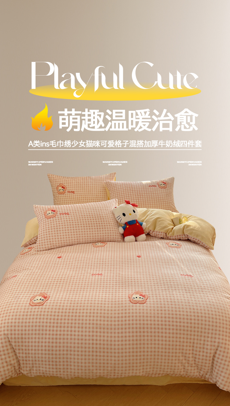 当前位置: 91家纺网 > 商品网购 > 床品套件 > 四件套 > 牛奶绒四件套 > 桃子家居 2025新款A类ins毛巾绣少女猫咪可爱格子混搭加厚牛奶绒系列四件套 绒毛巾绣-花儿猫粉黄
