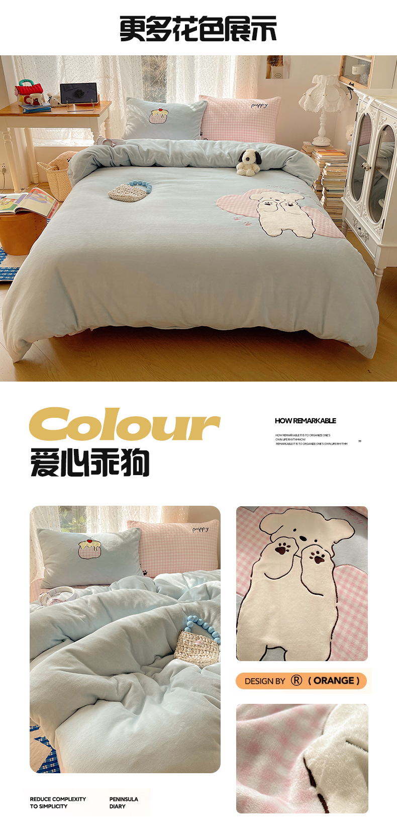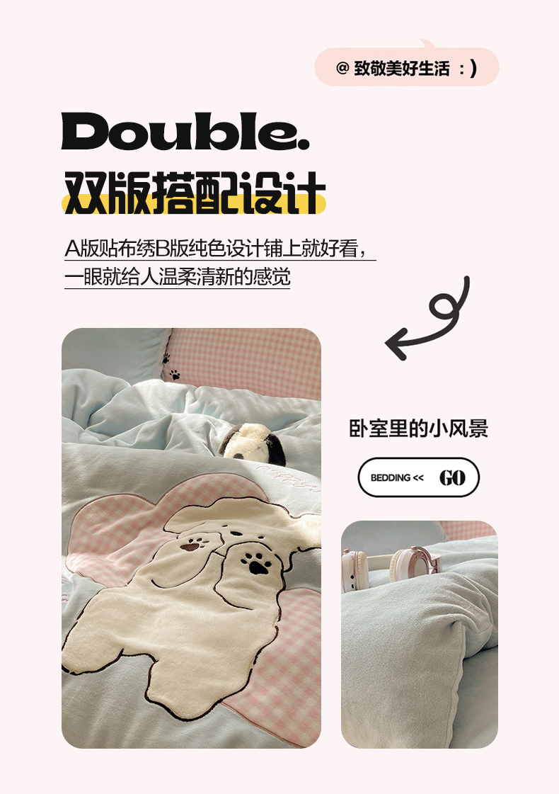 (总)轻奢坊 2025新款牛奶绒ins可爱贴布绣四件套,爱心乖狗,洛丽塔猫,苹果黑猫,晚安小狗,笑脸红格,笑脸咖格