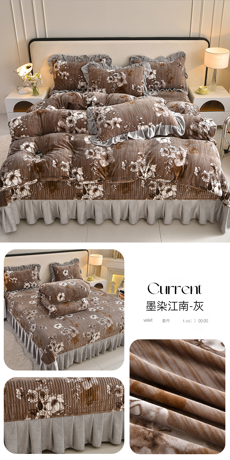 商品名称:赫本家纺 2025高克重牛奶绒花边床盖款四件套 墨染江南-灰