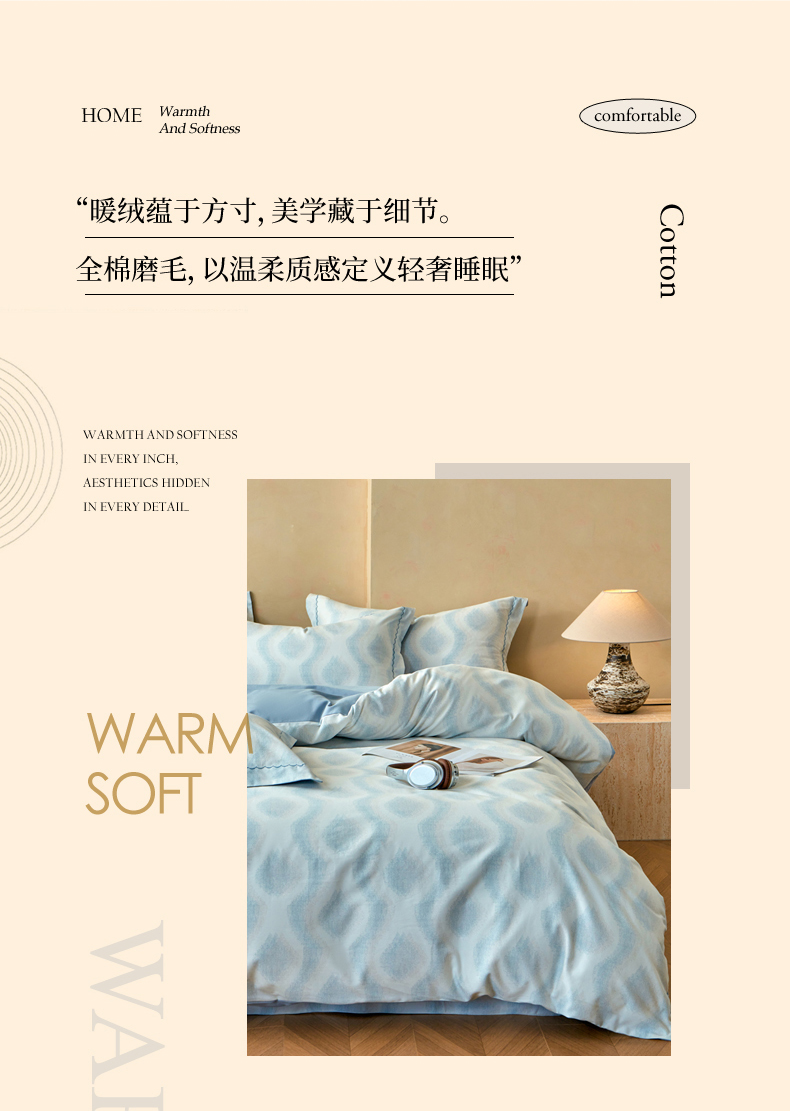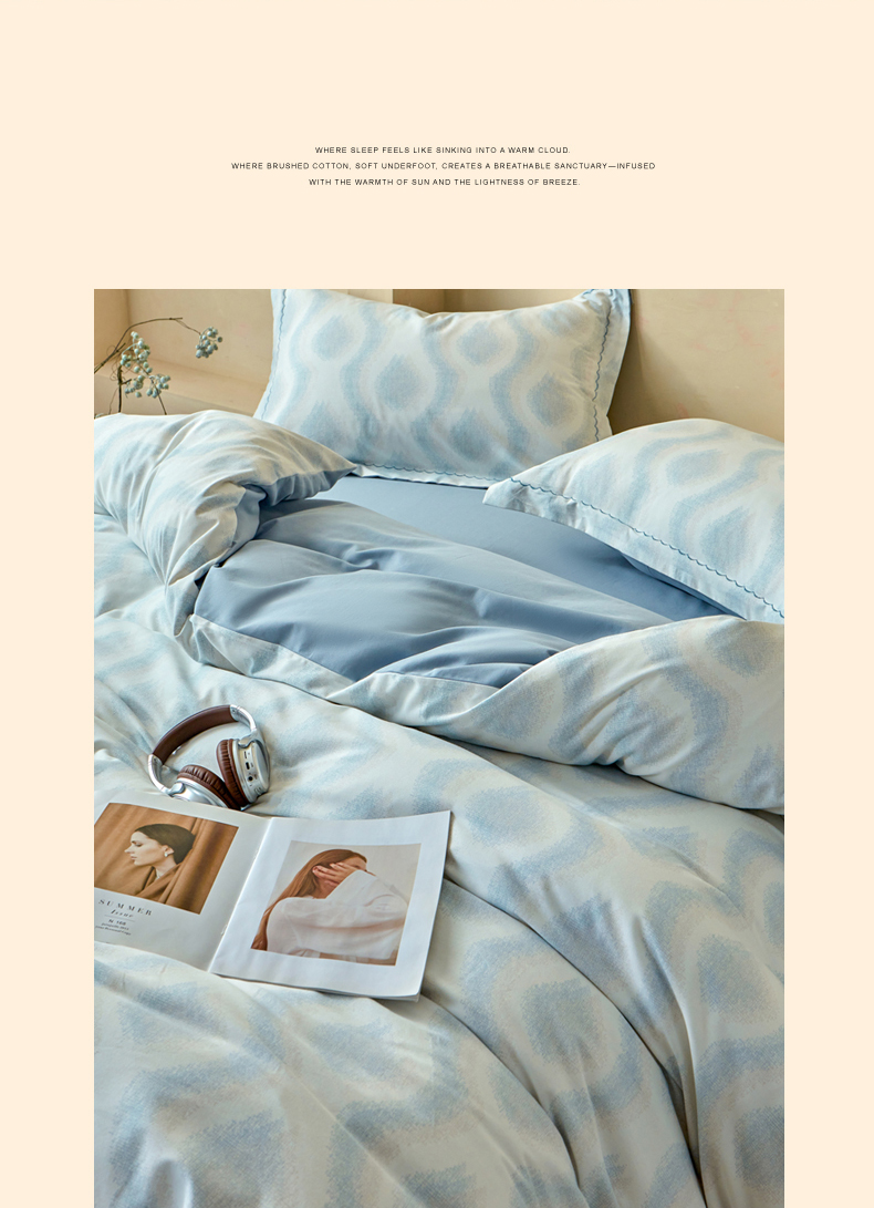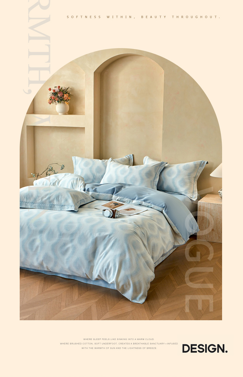 洺兰家居 2025年新款秋冬加厚全棉磨毛四件套纯棉生态磨毛印花套件 雾里看花-蓝