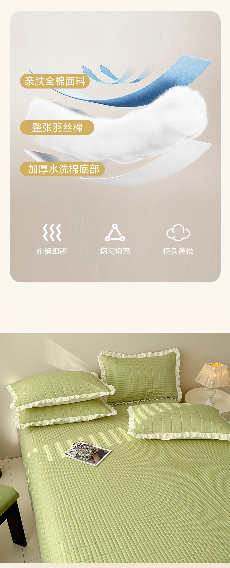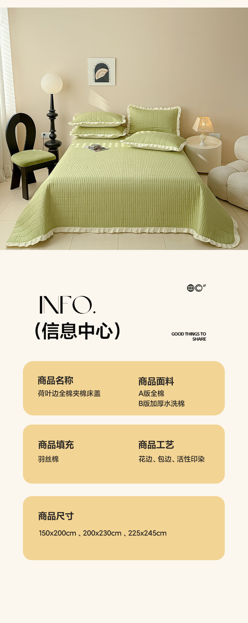 • 91家纺网 家纺一手货源 找家纺 妮可 2025新款荷叶边纯棉绗缝四季款多功能床盖 森林绿