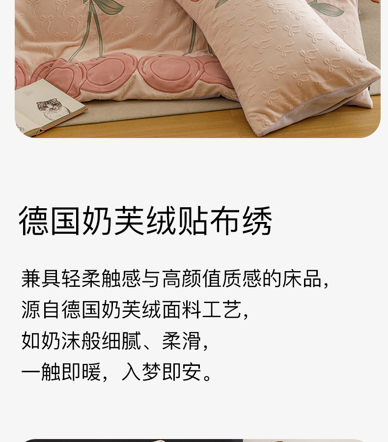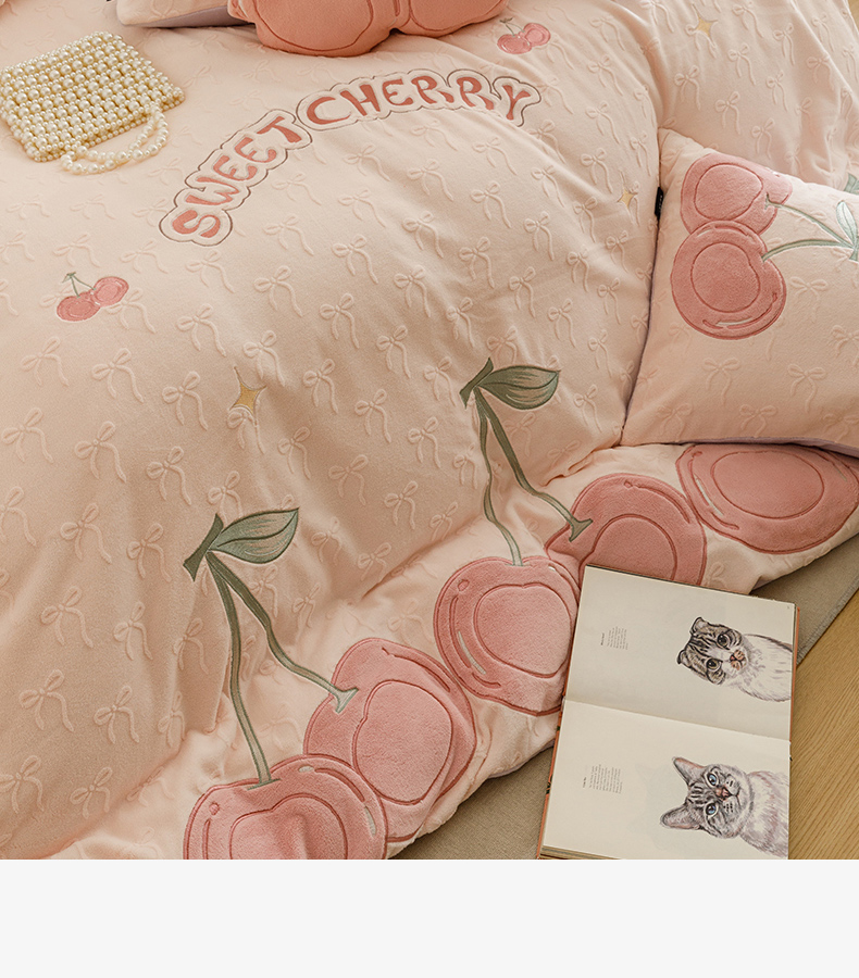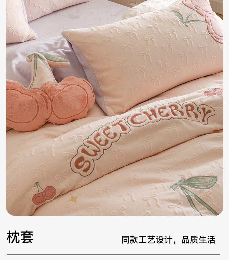 商品名称:卡姿家纺 2025秋冬德国奶芙绒提花甜美风—樱桃可颂 樱桃可颂-浅粉