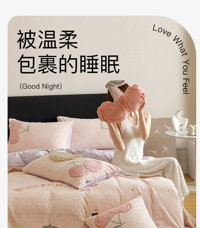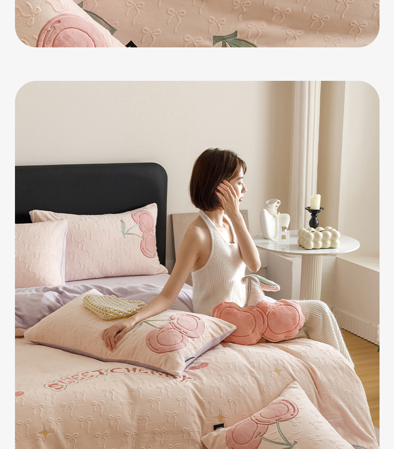 卡姿家纺 2025秋冬德国奶芙绒提花甜美风—樱桃可颂 樱桃可颂-浅粉