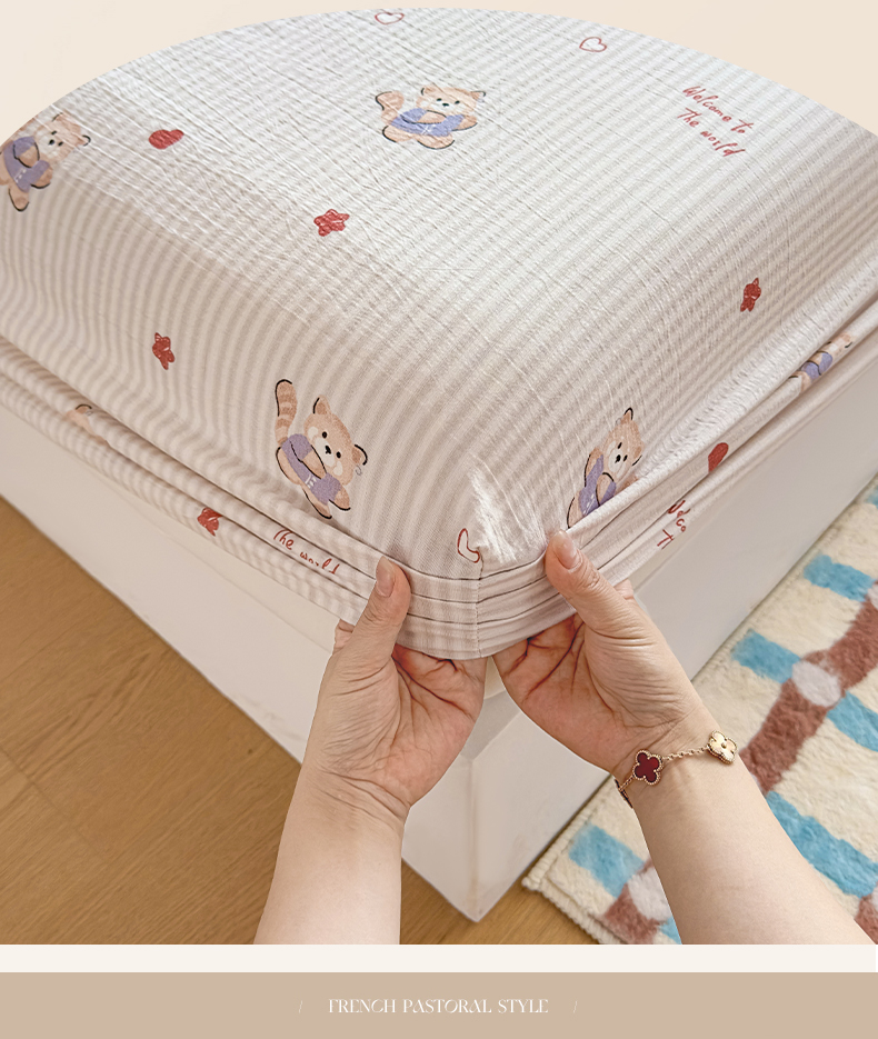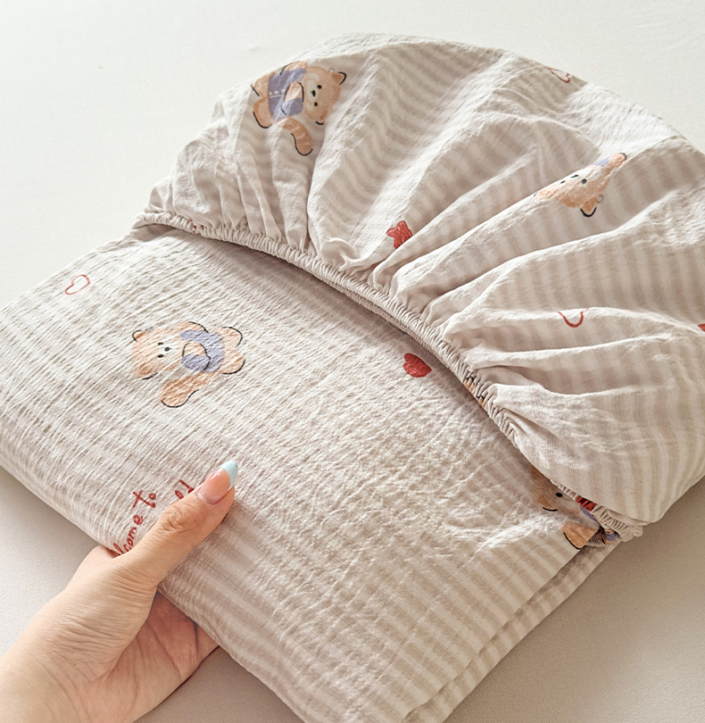 • 91家纺网 家纺一手货源 找家纺 麦乐迪 2025新款A类云感双层纱印花床笠 棕熊条纹灰