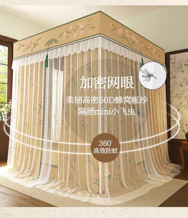 艾晶美家纺有限公司 2025新款新中风双层双杆5面遮光落地宫廷蚊帐 粉枝花影