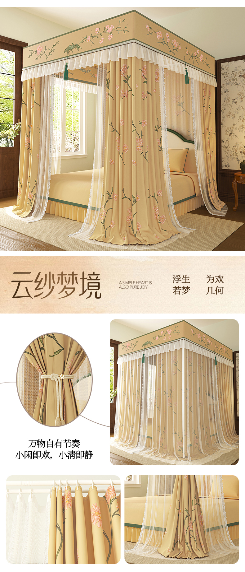 (总)艾晶美家纺有限公司 2025新款新中风双层双杆5面遮光落地宫廷蚊帐,粉枝花影,寒梅映阁,花簇橘裳,兰枝映月,云纱梦境,竹韵绕阁