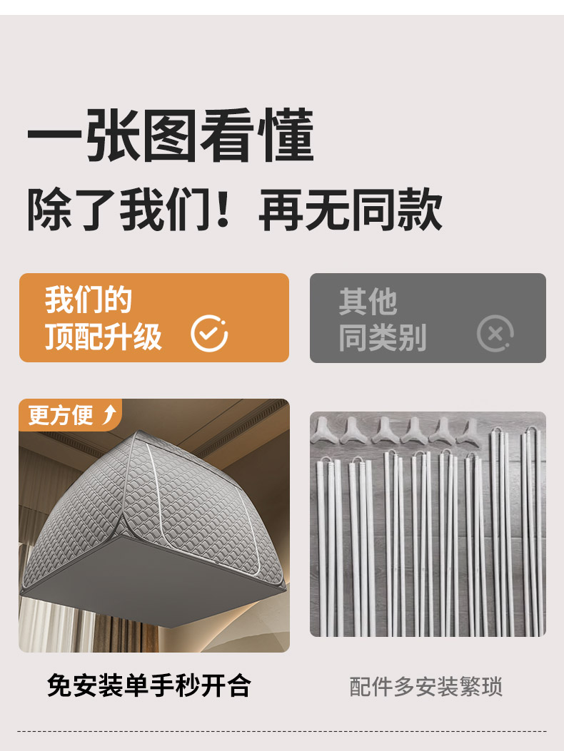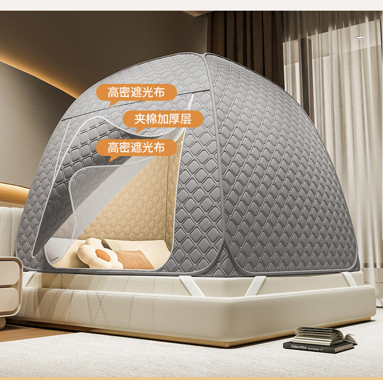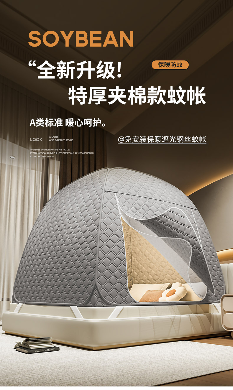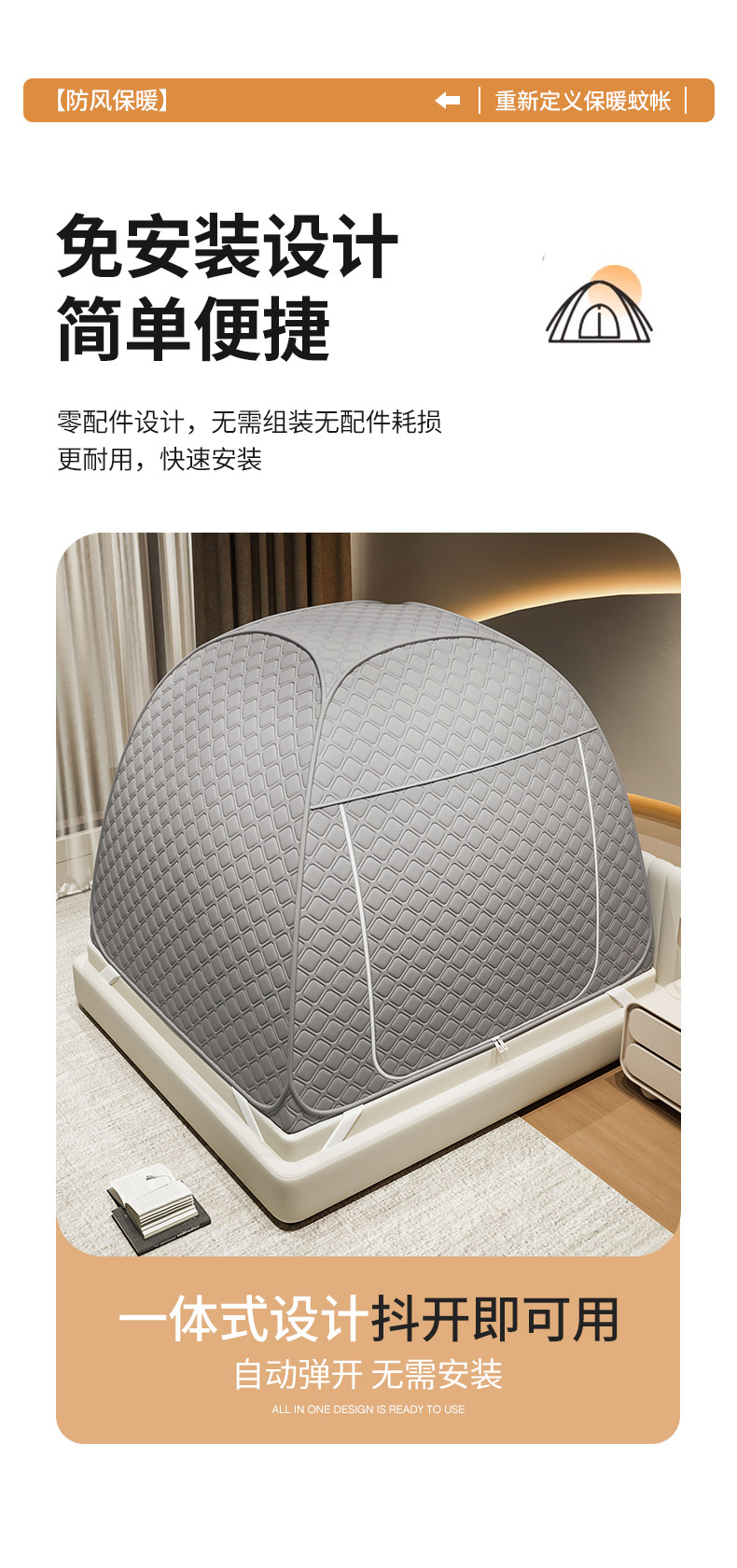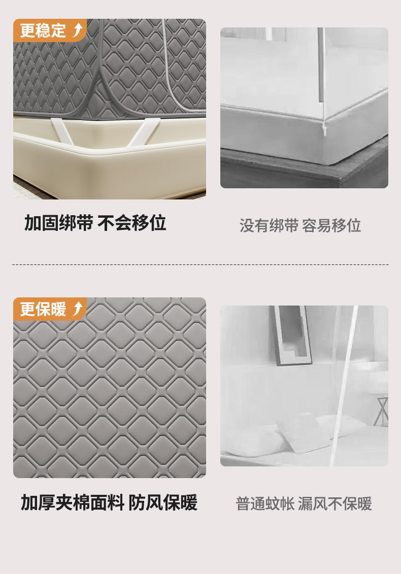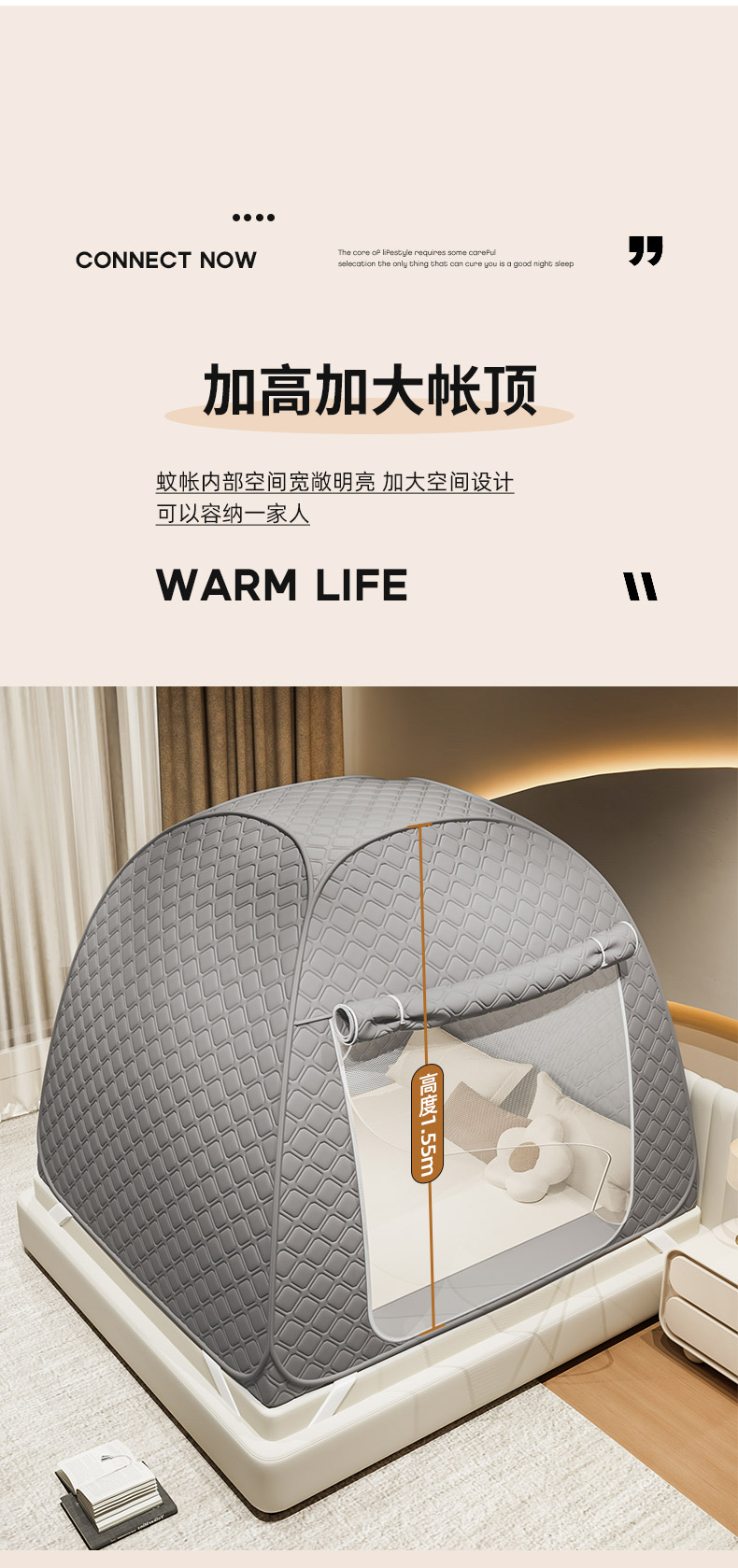 商品名称:海虹蚊帐 2025新款免安装保暖遮光钢丝蚊帐 浅灰夹棉特厚回底