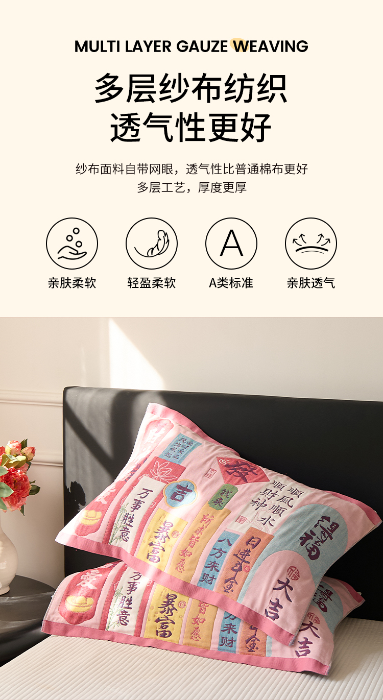 沐瑟家纺 2025新款纯棉纱布枕巾八层枕巾-發 命里招财