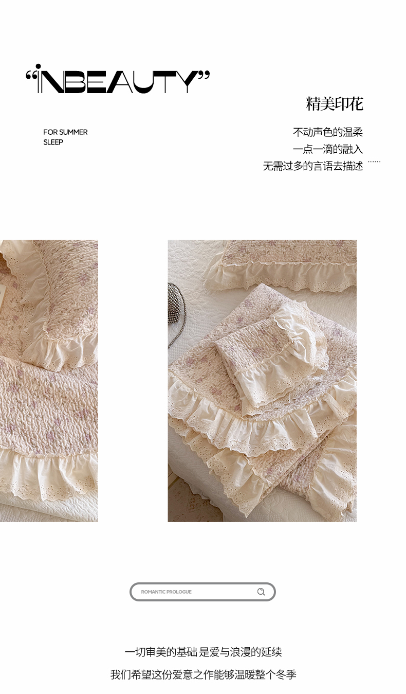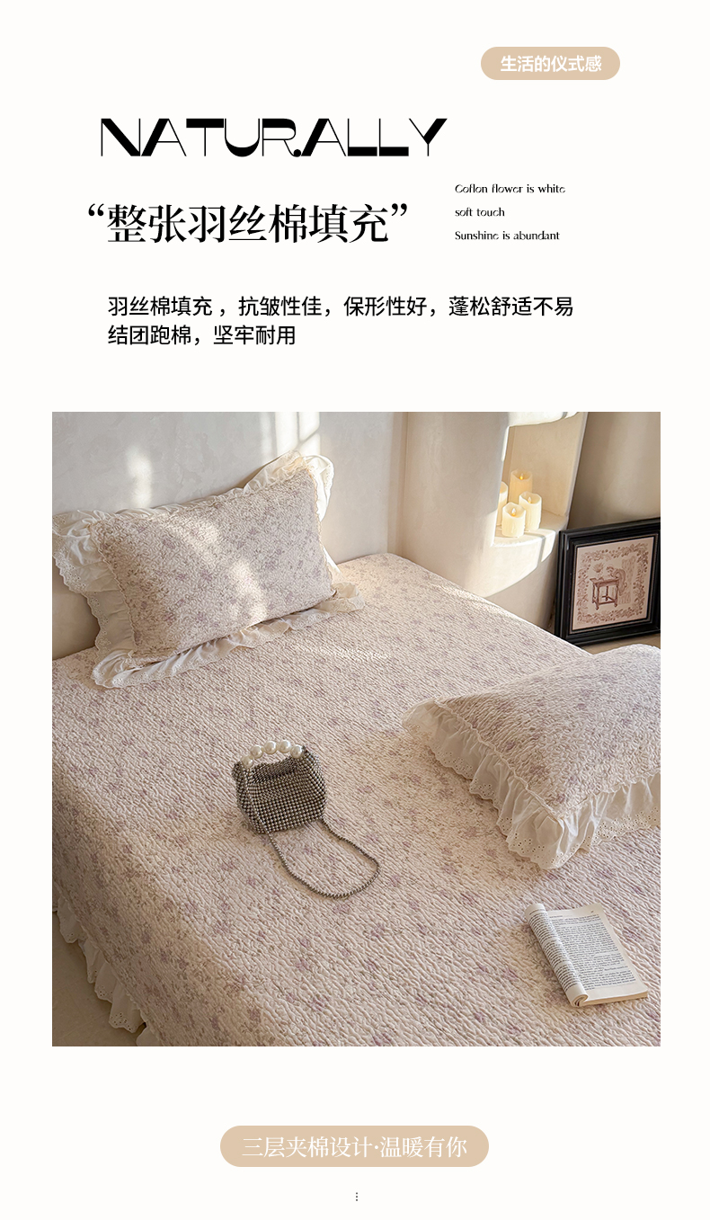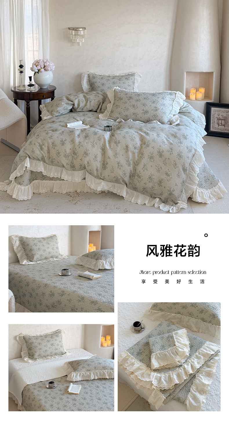 商品名称:琳可家居 2026新款印花全棉双层纱床盖棉布花边高温水洗A类标准夹棉可机洗 花之语