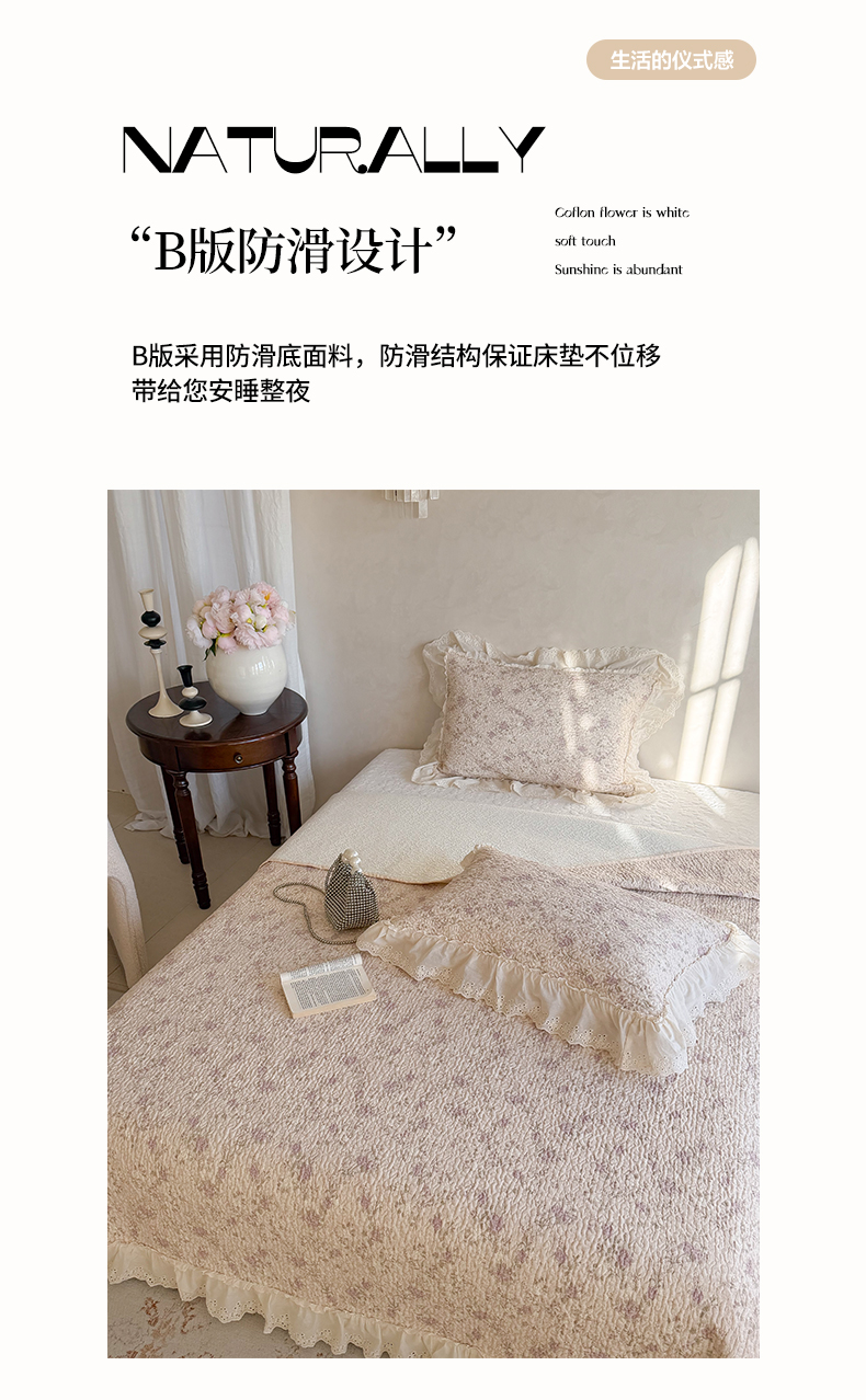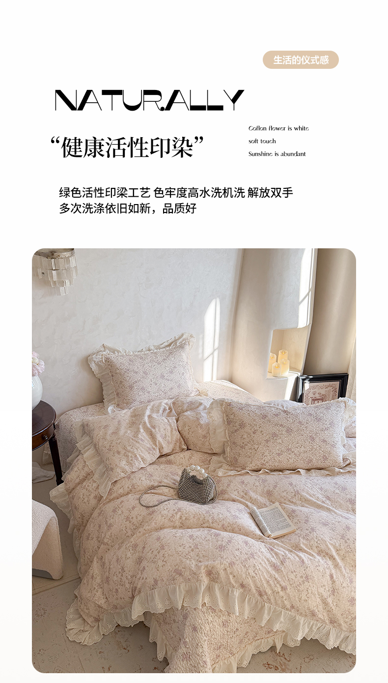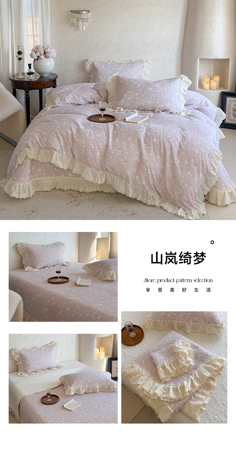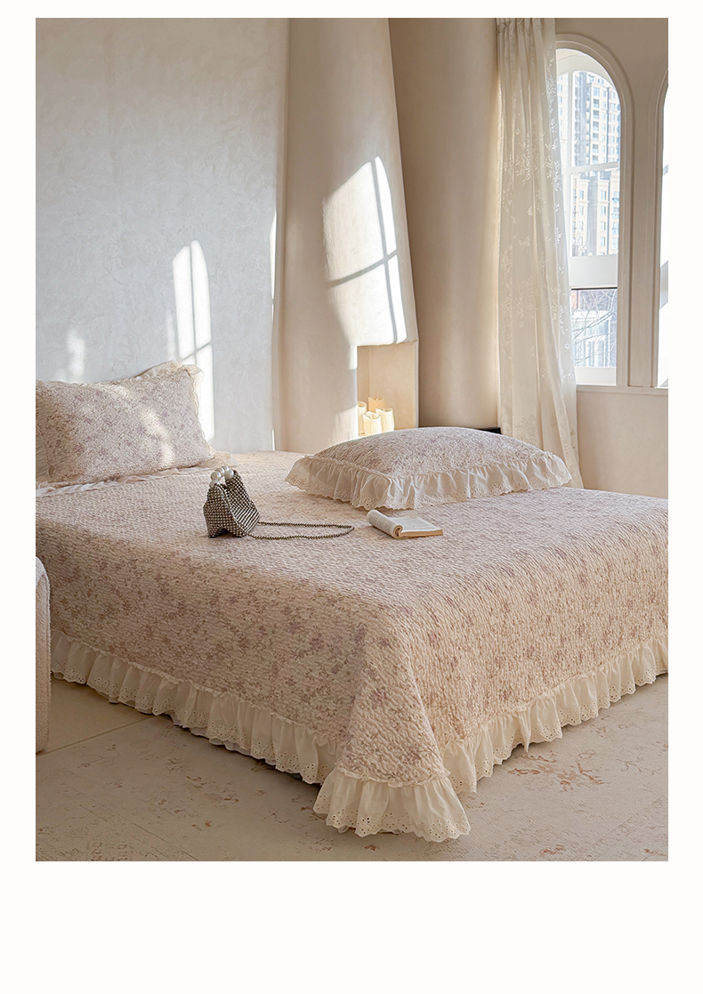 商品名称:琳可家居 2026新款印花全棉双层纱床盖棉布花边高温水洗A类标准夹棉可机洗 花之语