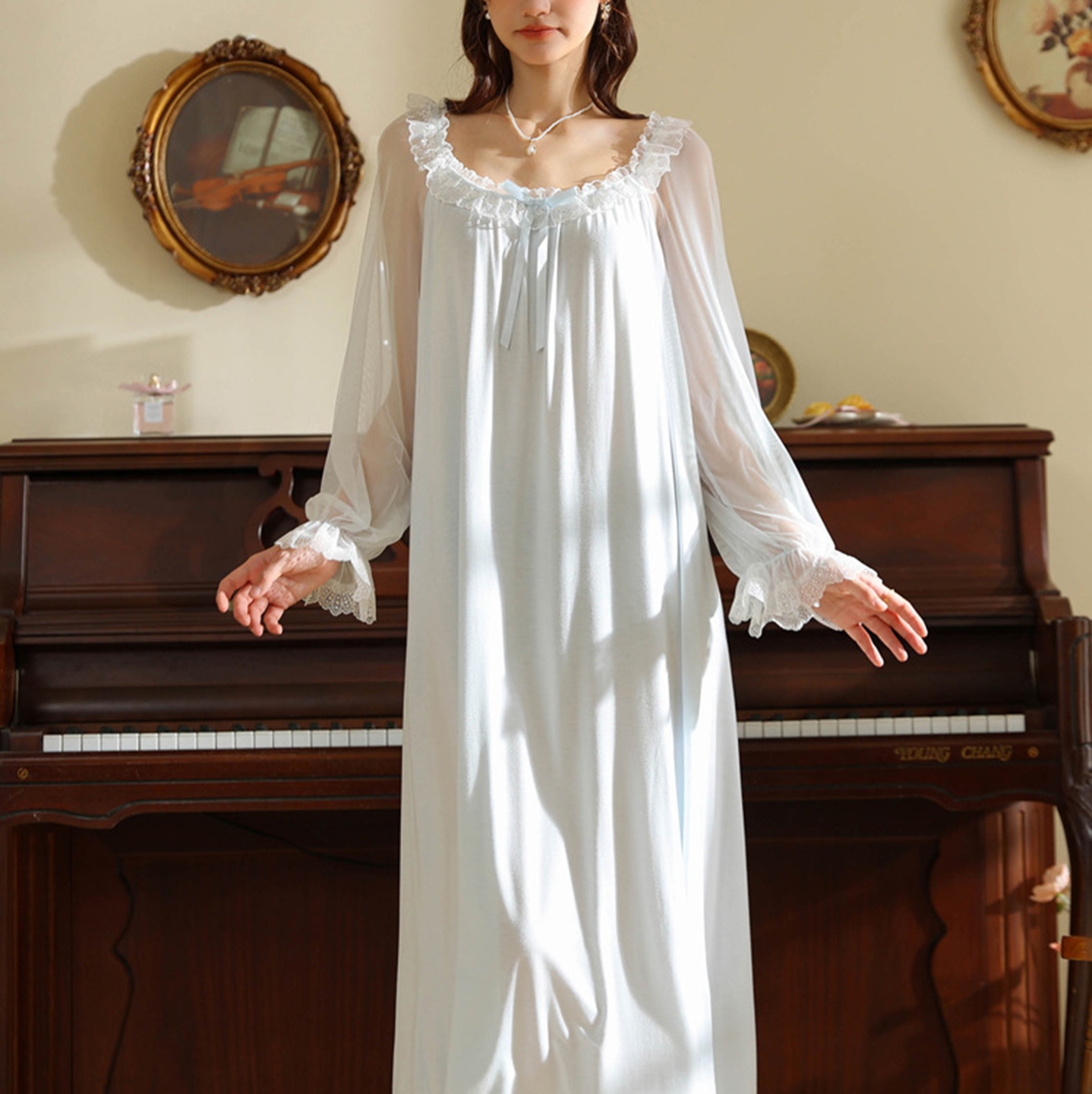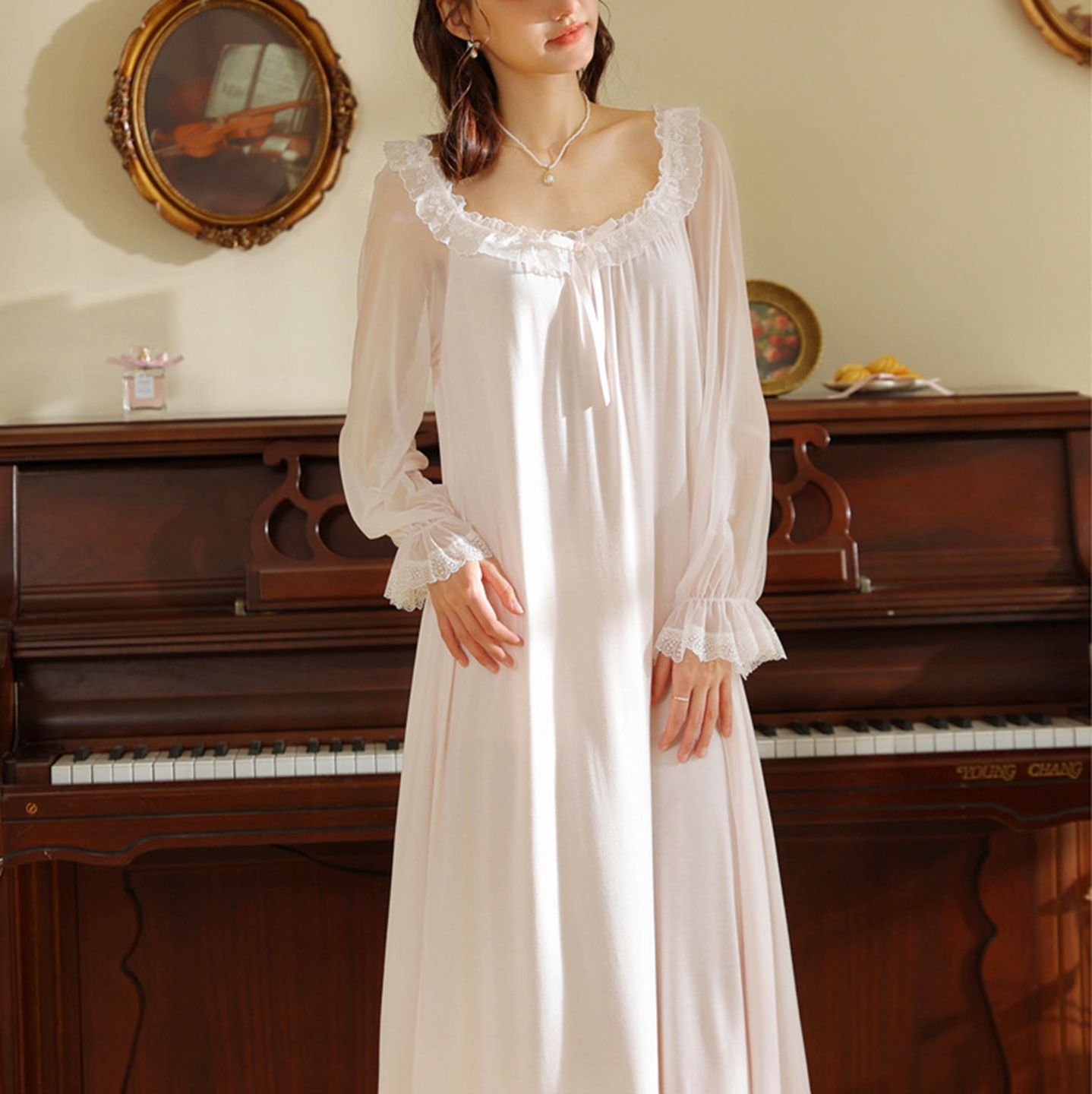 商品名称:洛兰沙家居馆 2026新款宫廷风甜美公主法式复古宽松圆领女春秋针织棉长袖睡衣睡裙 黑色